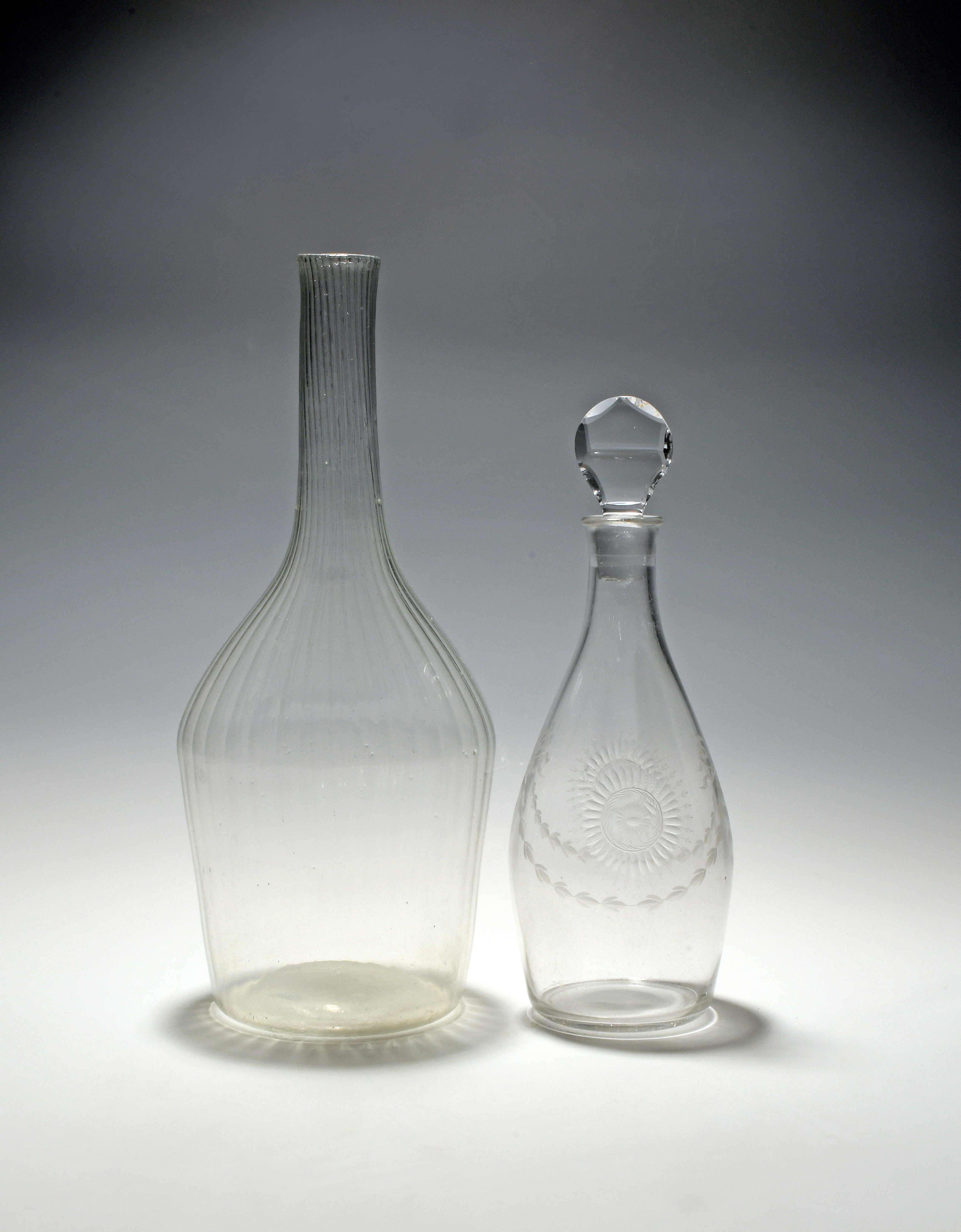A glass decanter and stopper, c.1800, the mallet shape engraved with roundels and tied leaf swags, with a faceted flat stopper, and a Continental magnum bottle or carafe, moulded with vertical flutes, 35.3cm max. (3)