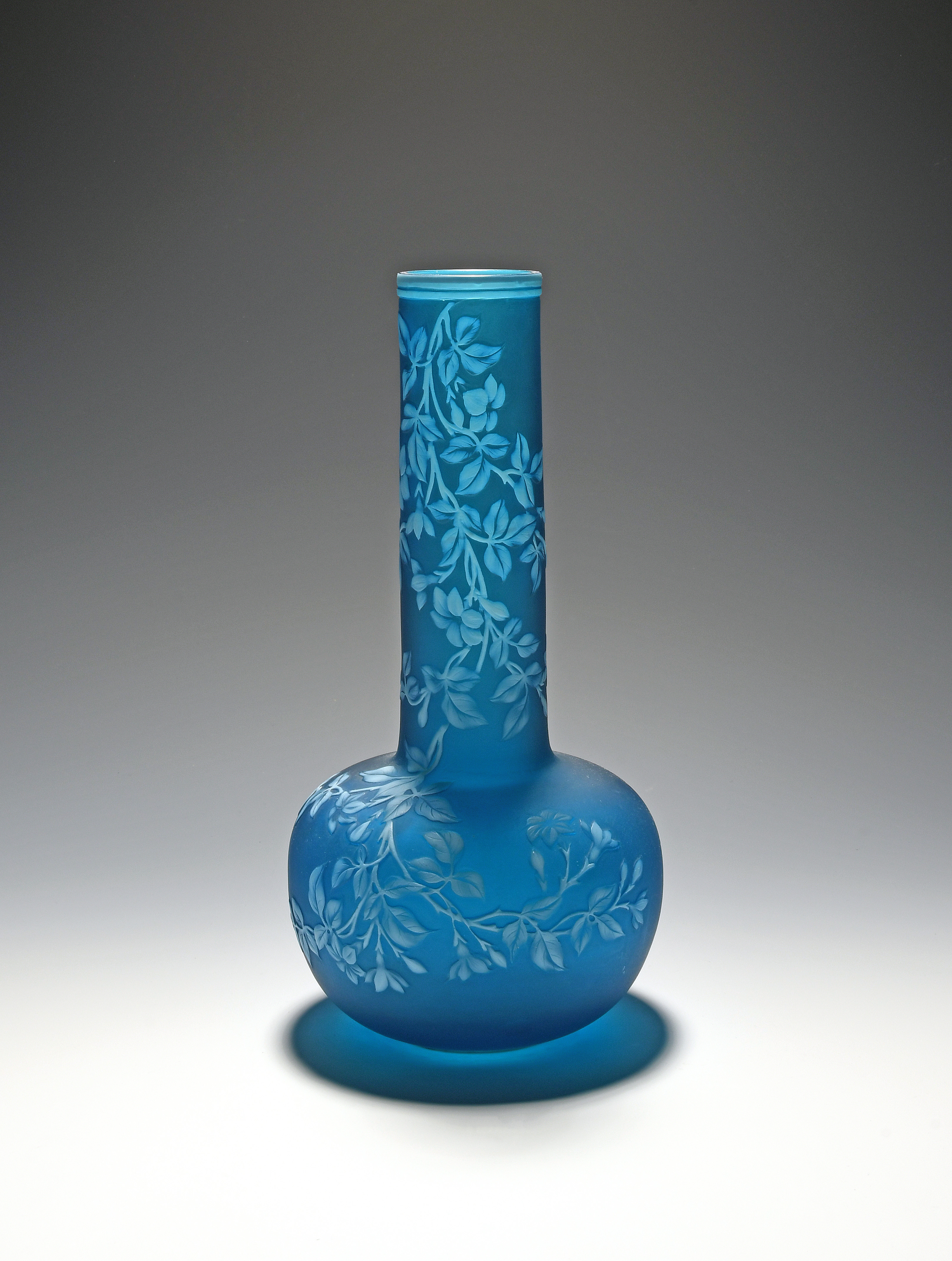 A Thomas Webb & Sons (Stourbridge) cameo glass vase, c.1880-90, of bottle form with a tall cylindrical neck rising from a squat body, the blue ground overlaid in white with tumbling branches of flowering jasmine, the reverse with a single moth or butterfly in flight, circular mark to the base, 23.1cm.