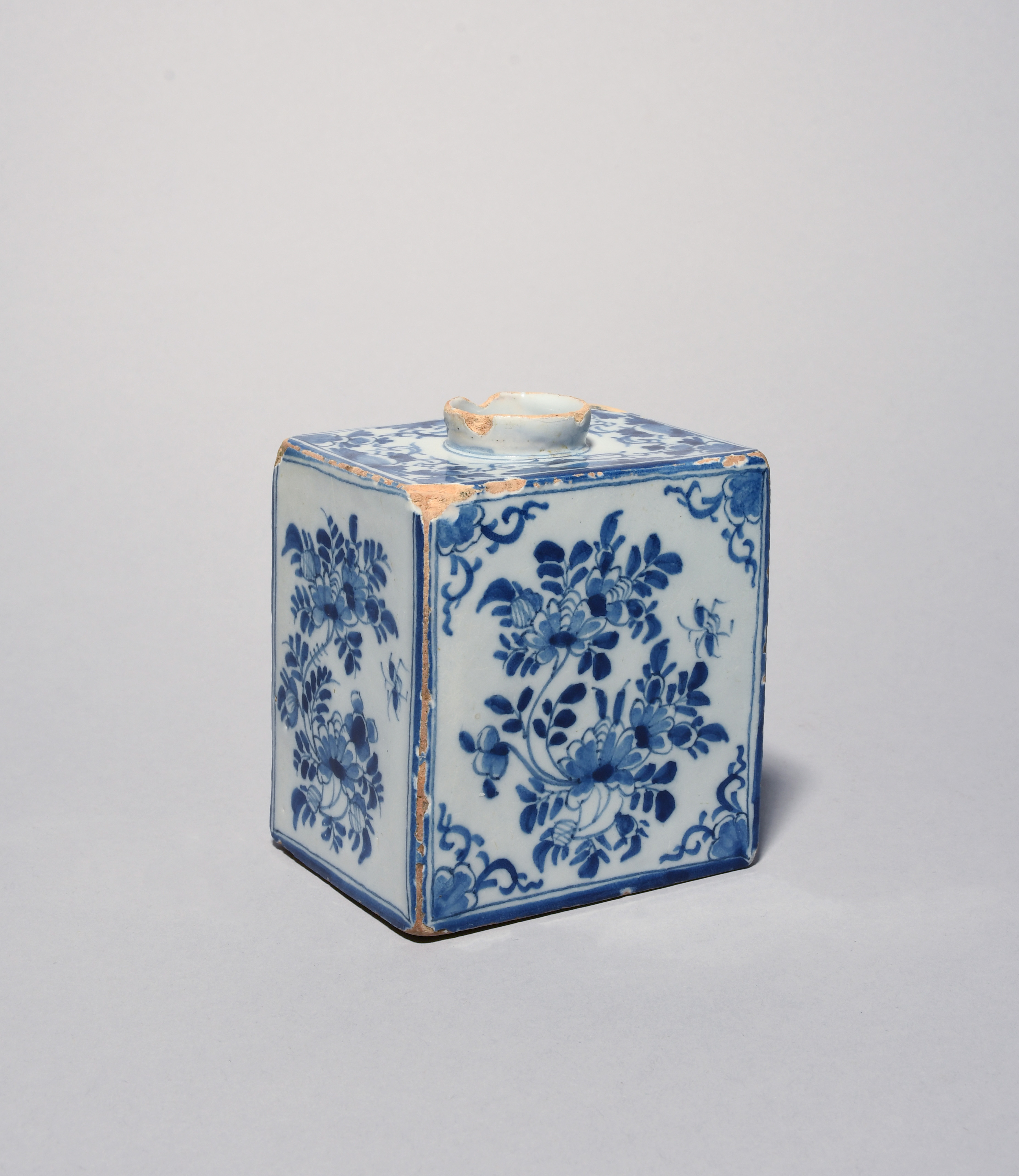 A rare Delft tea canister, 1st half 18th century, of rectangular form, painted in blue with flowering branches, the shoulders with formal motifs, a little chipping, 9.7cm high.