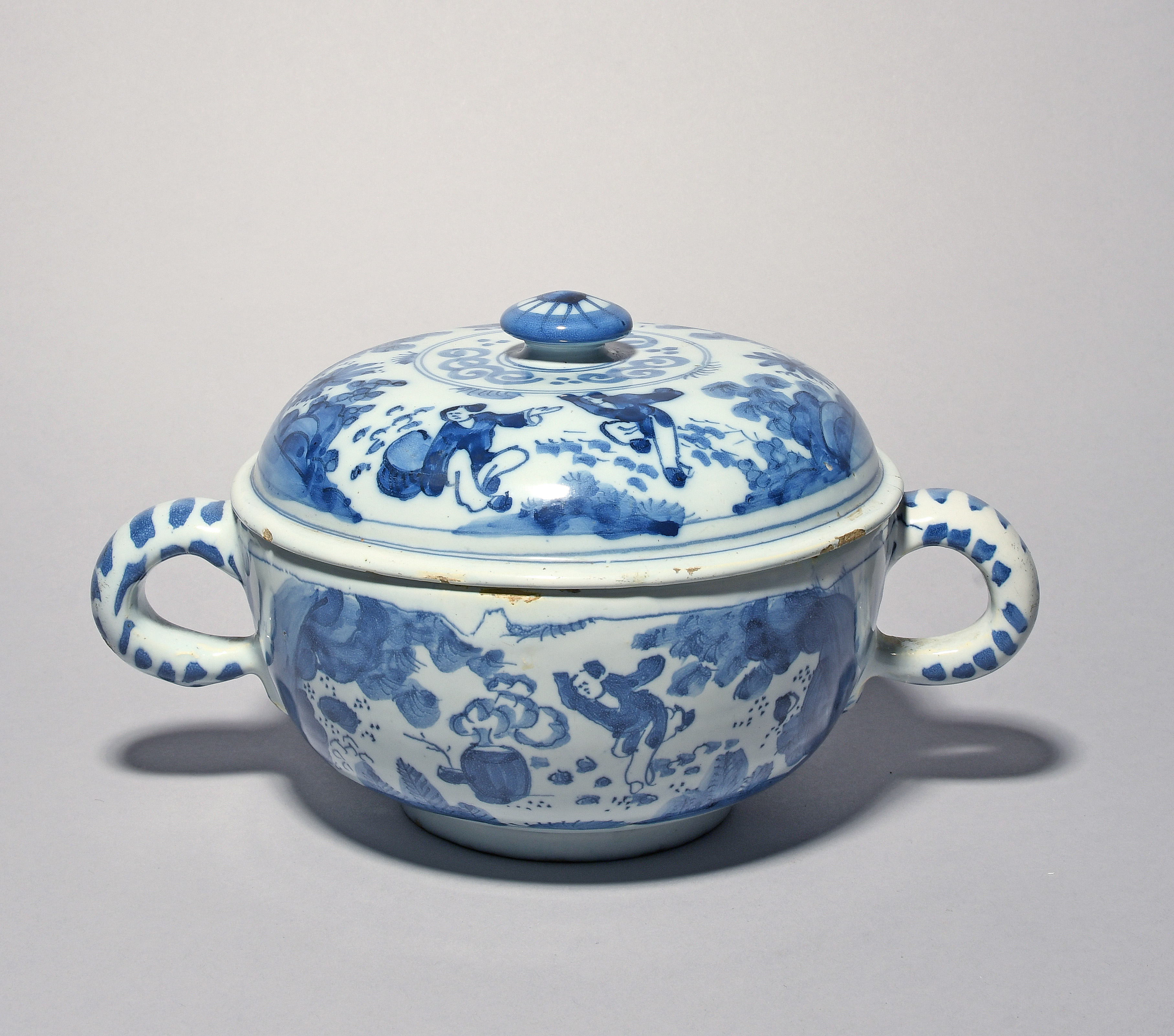A Delft broth bowl or milk tureen and cover, c.1690, the circular form painted in blue with Chinese figures in a garden, dancing beside vessels issuing smoke, the loop handles with blue dashes, each piece marked VS I, a crack to the cover, 27.5cm across. (2)