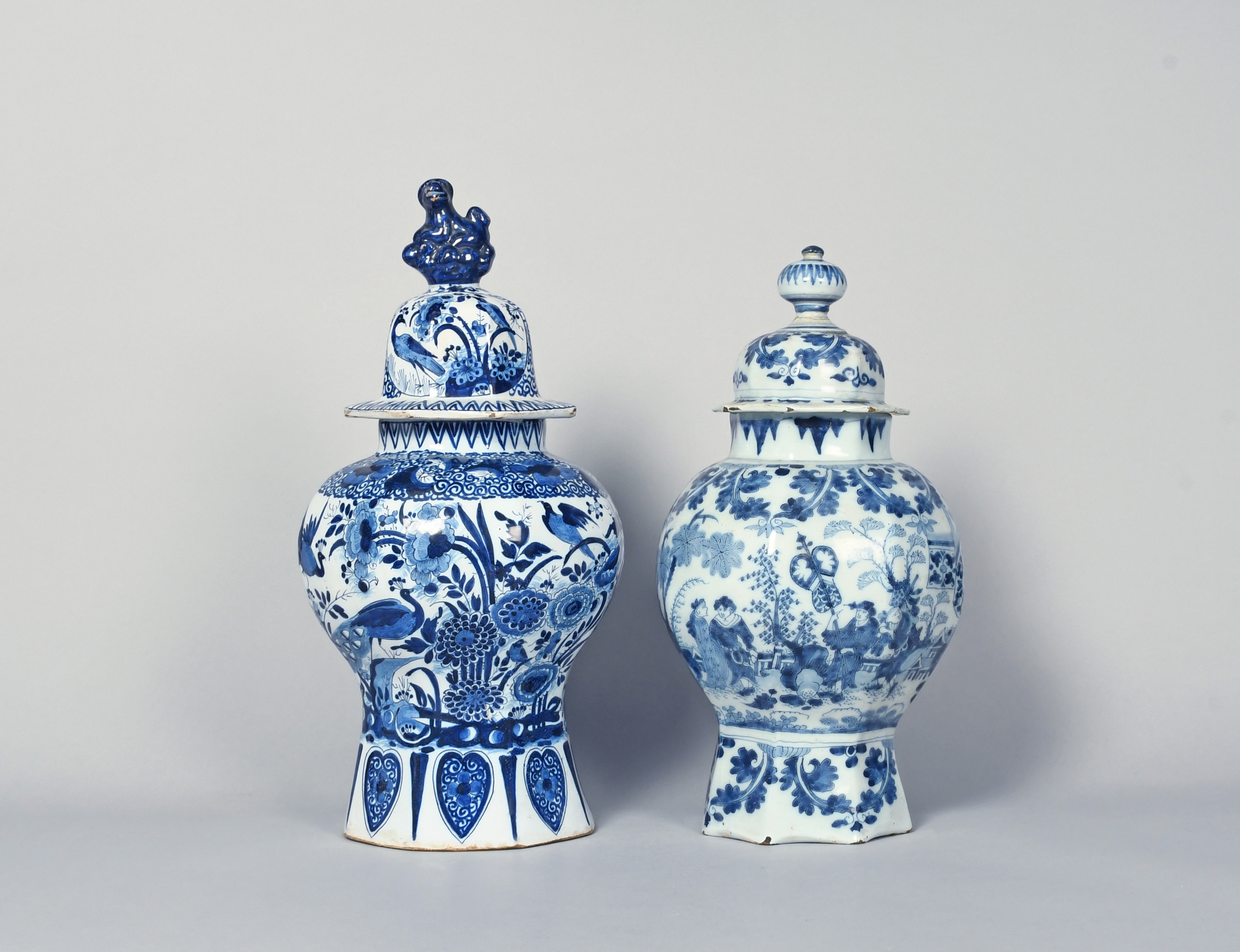 Two Delft vases and covers, 18th century, of octagonal baluster form, the smaller painted with Chinese figures and birds beneath trees in a garden setting, within formal leaf borders, marked for de porceleyn Schotel (the Porcelain Dish) manufactory, the other with peacocks and other birds among flowering plants, the domed cover with a lion dog finial, with a CK mark, some damages, 44.2cm max. (4)