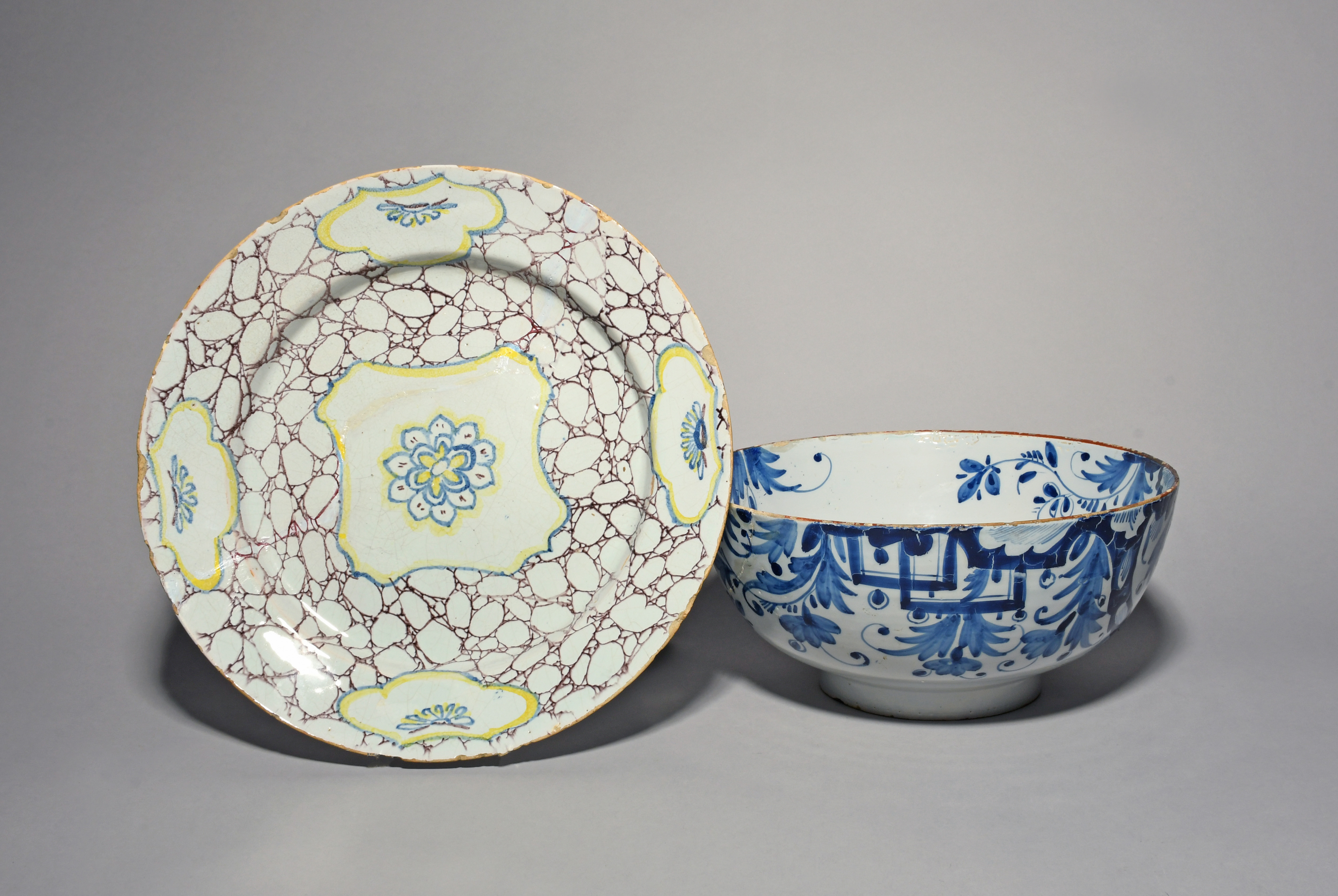 A large delftware punch bowl, c.1770, painted in blue with formal foliate scrolls, and a delftware charger, painted in blue, yellow and manganese with a central flowerhead within a panel on a cracked ice ground, damages and repairs, 33.7cm max. (2)