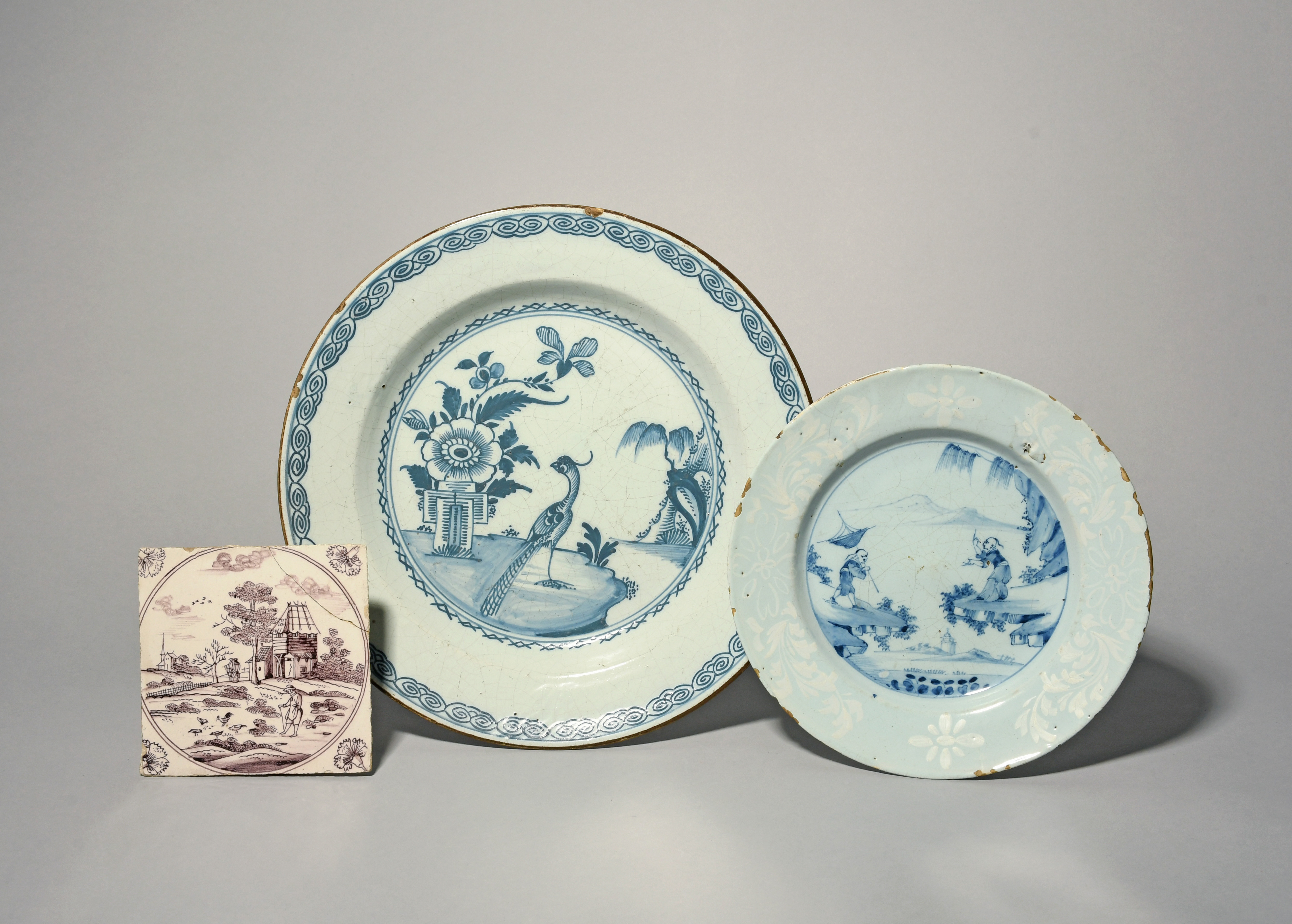 A delftware plate, c.1760, painted in blue with two Chinese figures communicating between rocky ledges, the rim with a bianco-sopra-bianco border, a Delft charger painted with a peacock beside flowering plants, and a delftware tile, painted in manganese with a European figure feeding chickens, the corners with carnation motifs, some damages, 30.7cm max. (3)