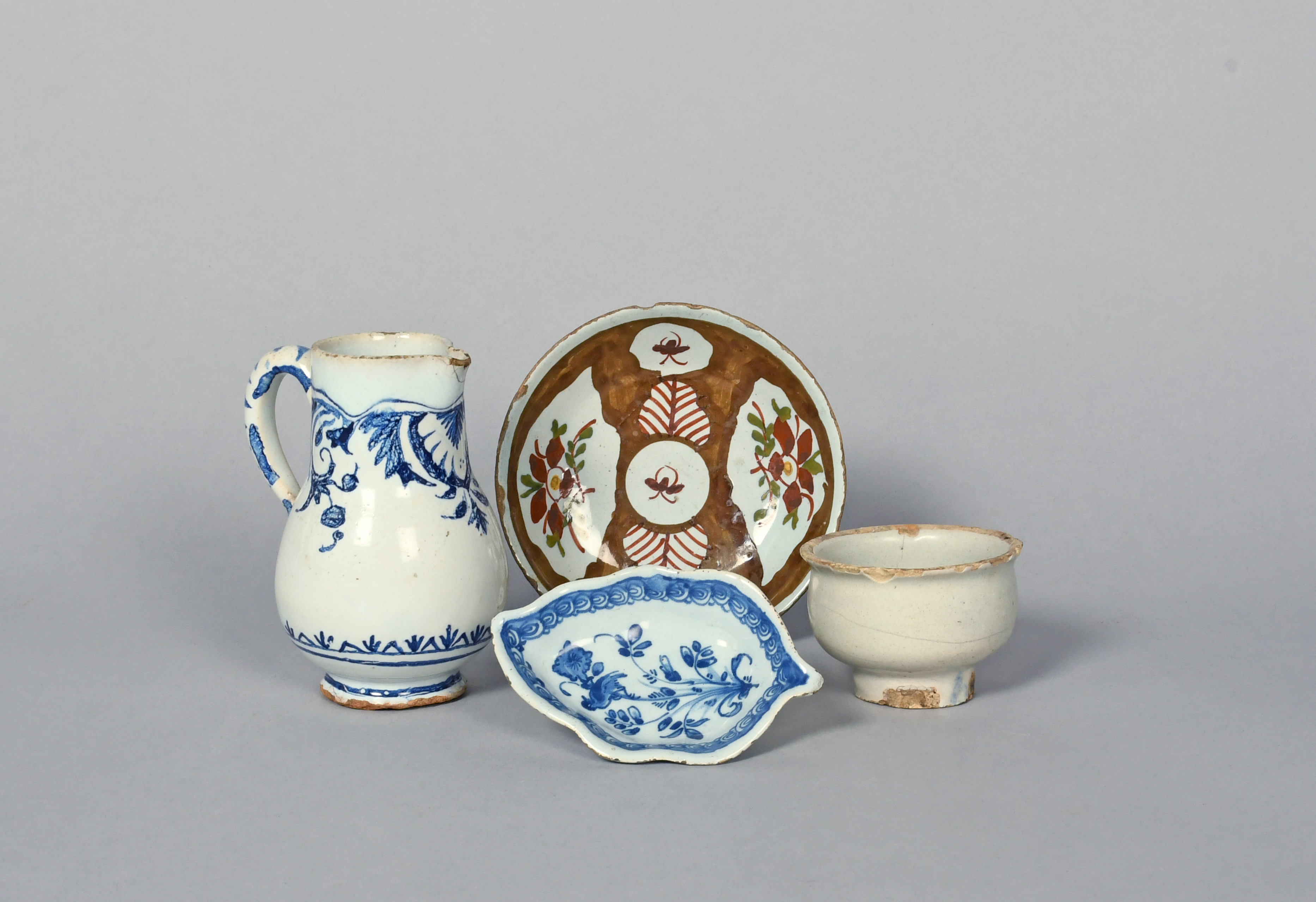 A delftware ointment pot, late 17th/early 18th century, decorated in a white glaze, a delftware leaf-shaped pickle dish, a saucer painted with flower panels on a brown ground, and a Delft milk jug painted with foliate sprays, 10.8cm max. (4)
