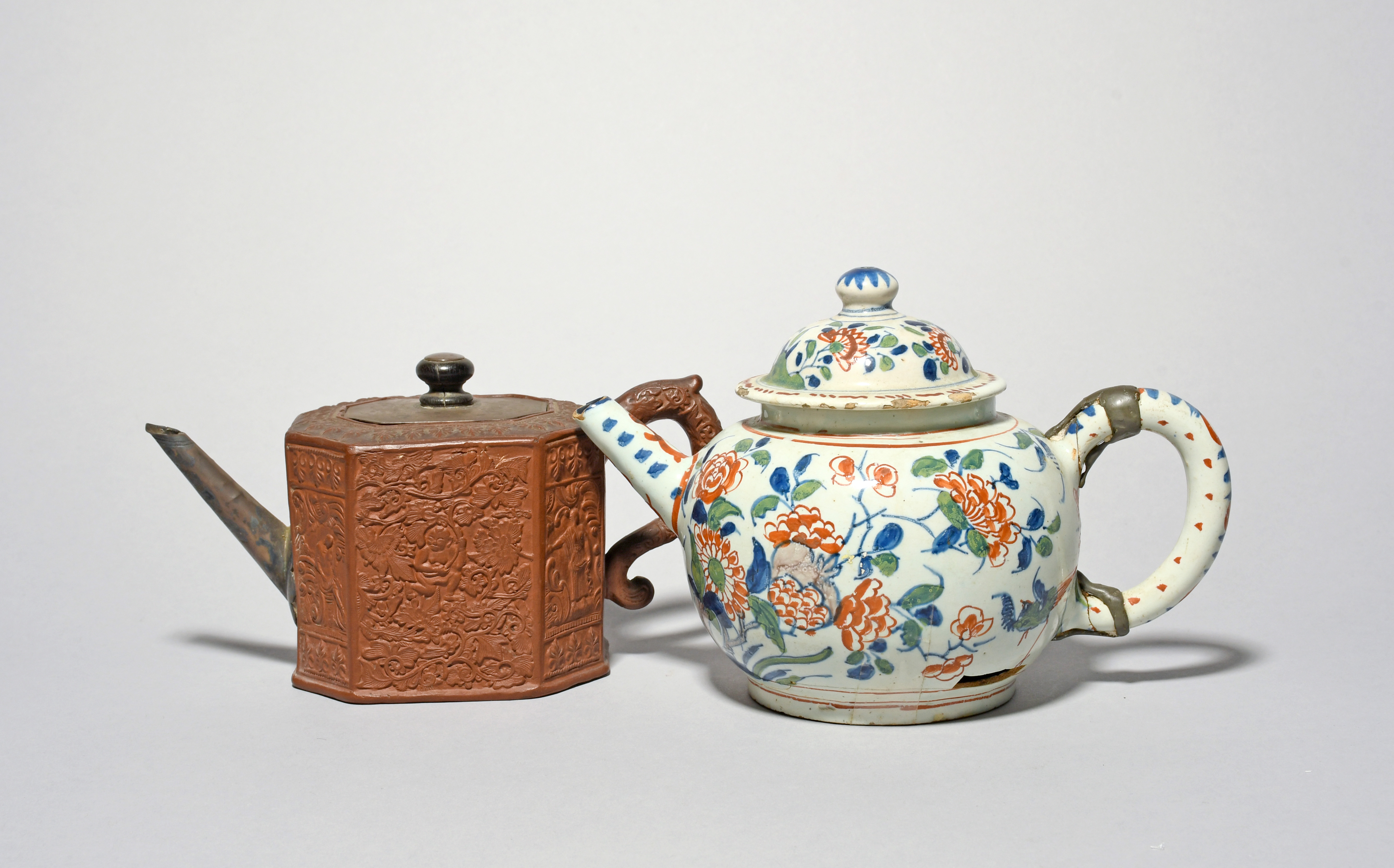 A redware teapot and silver cover, c.1750-60, attributed to Thomas Whieldon, the octagonal form ornately moulded with Chinese figures among foliage, with silver cover and spout, and a Delft teapot and cover, painted in blue, red and green with flowering branches, damages to the Delft, 19cm max. (4)