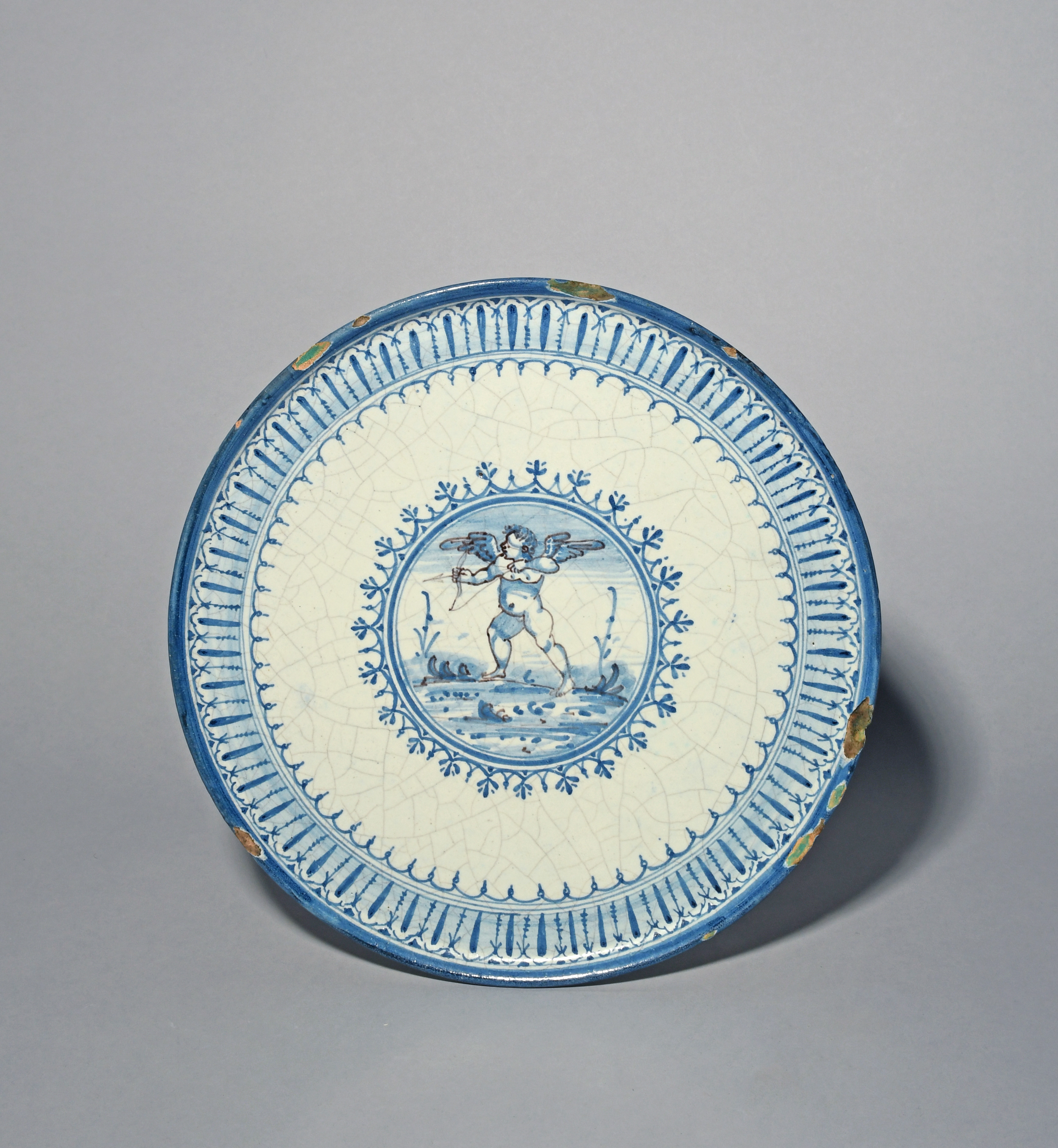 A Delft tazza, last quarter 17th century, painted in blue and manganese with Cupid firing an arrow from his bow, within a formal fleur de lys border, raised on a low knopped foot, some rim chipping, 26.2cm dia.