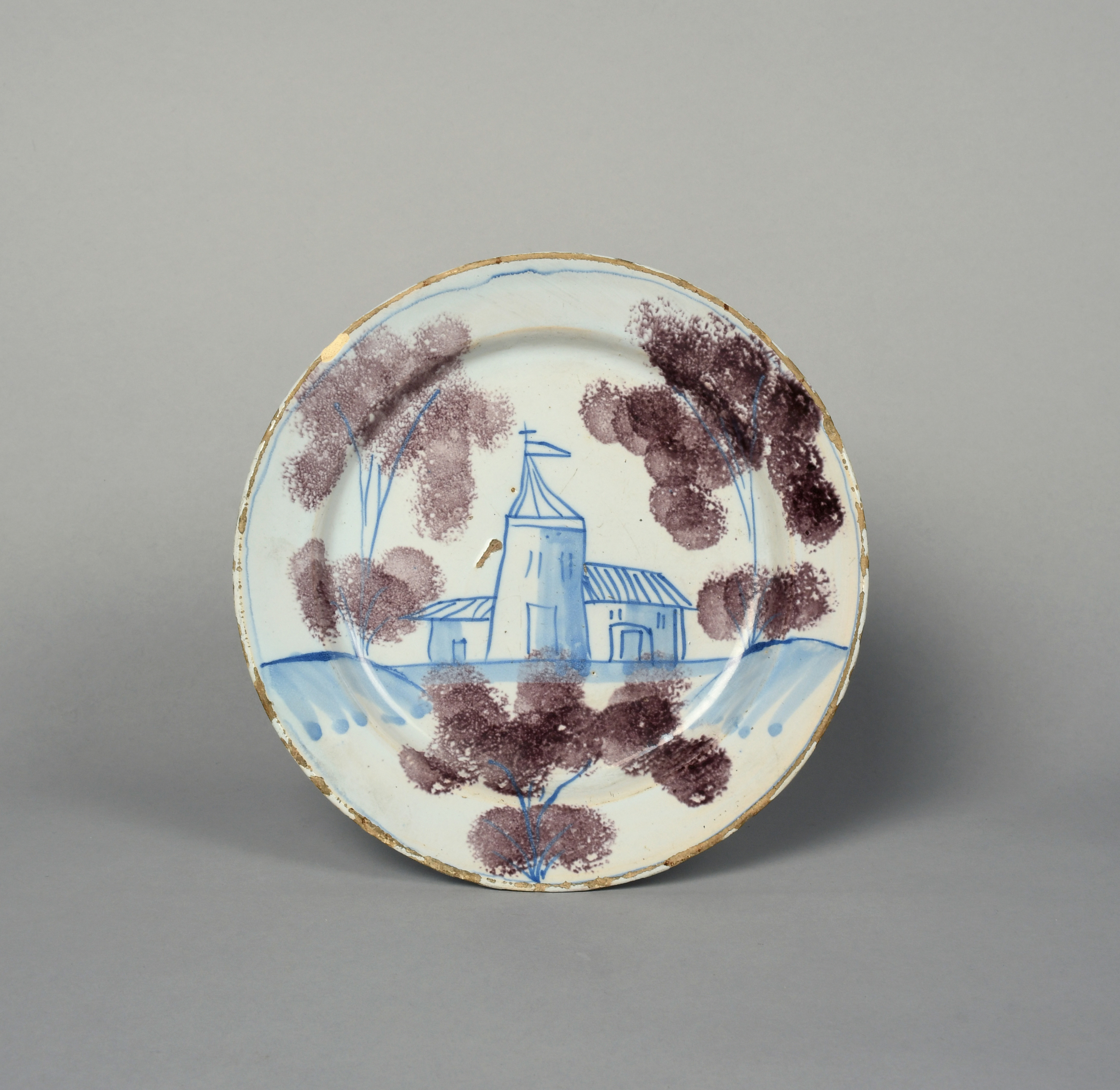 A delftware 'Farmyard' plate, c.1730, probably Bristol, painted in blue with a church flanked by tall trees with sponged manganese foliage, some rim chipping, 19.7cm.