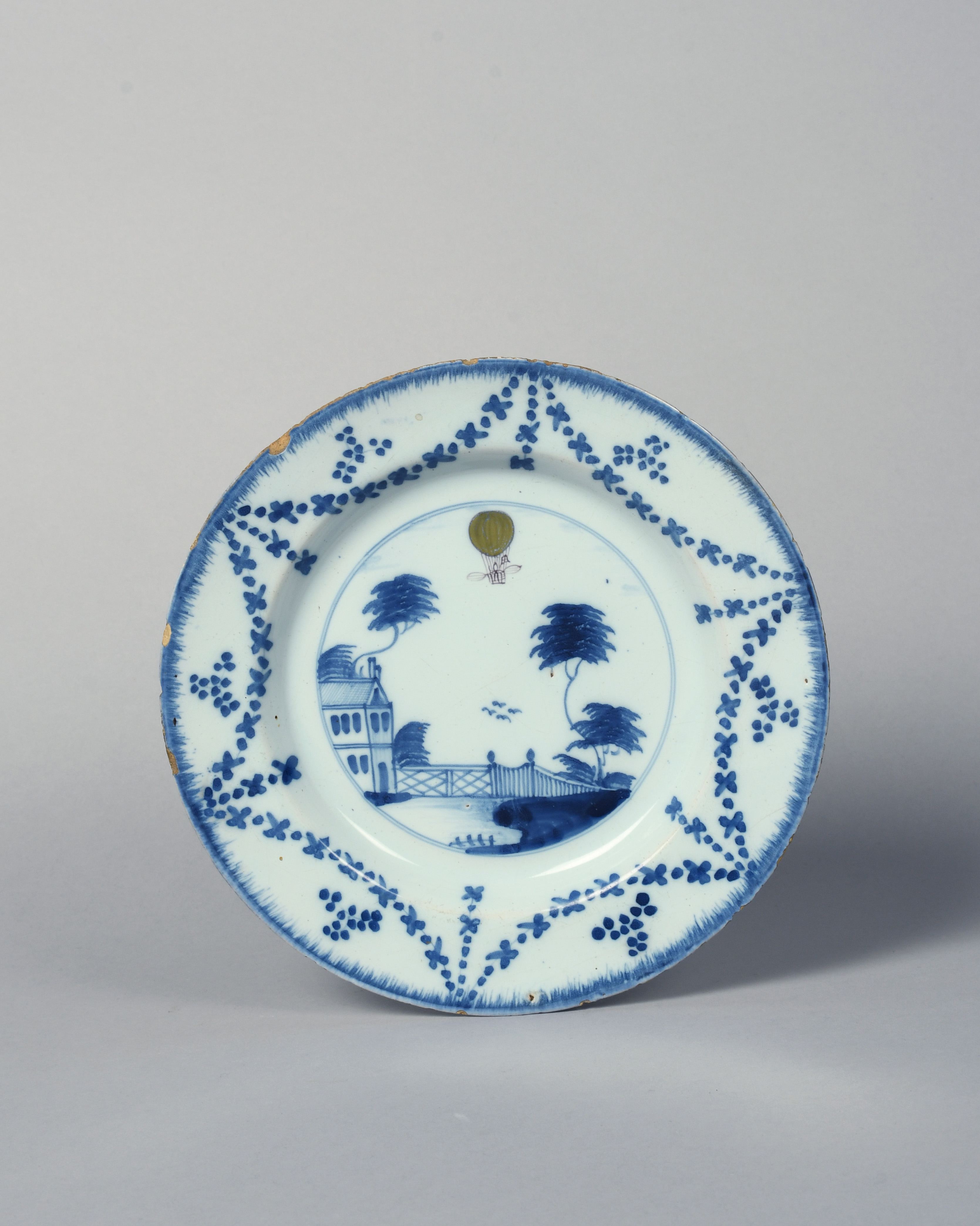 The plate depicts the balloon ascent of the Italian aeronaut Vincenzo Lunardi, whose first British flight took place in 1784. Lunardi executed several flights between 1784 and 1785, including at least one that took off from Southwark, near the delftware potteries.