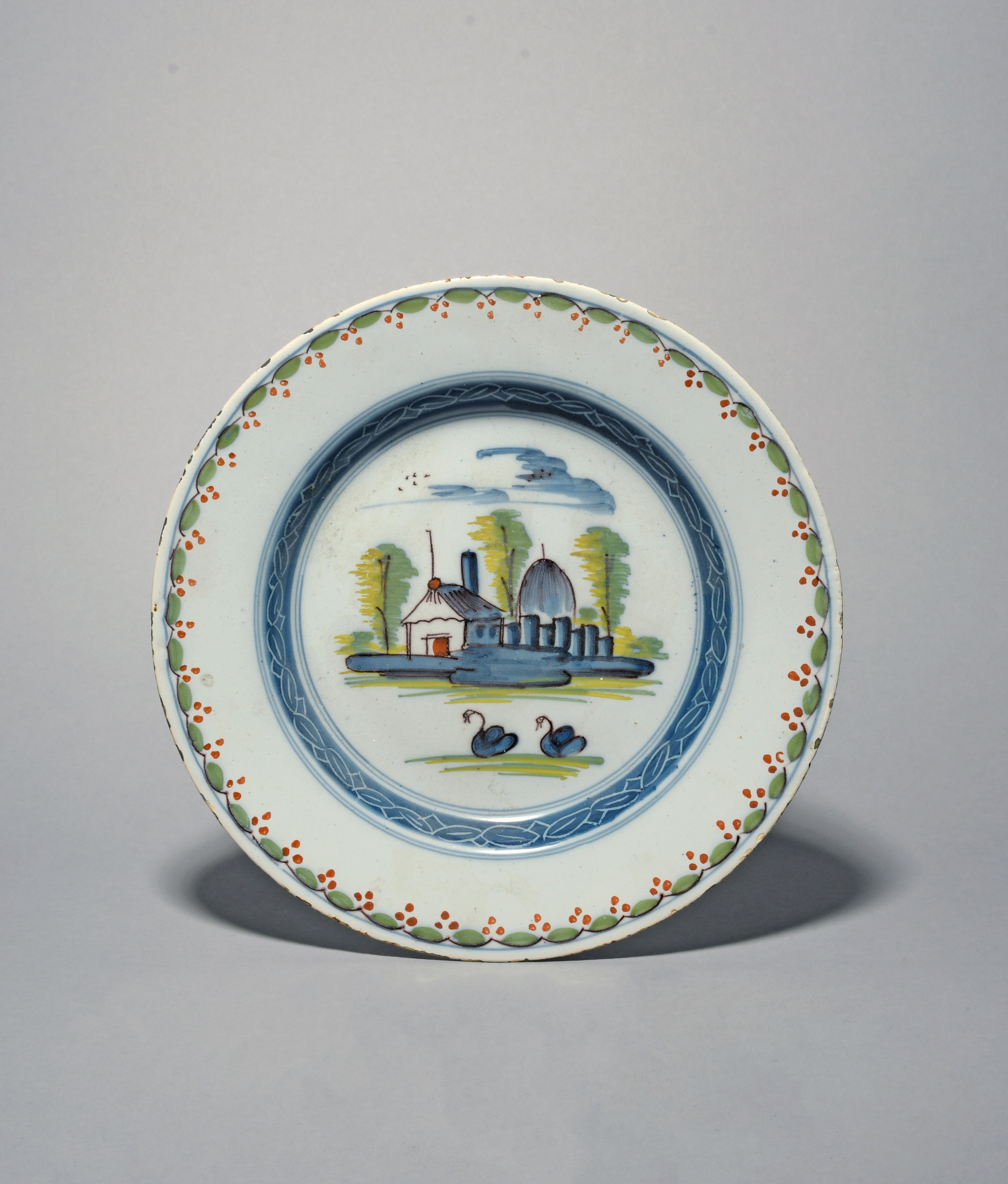 A delftware plate, c.1740, possibly Liverpool, painted in polychrome enamels with two swans swimming before low buildings and three trees, the rim with a berried border, 22.8cm.