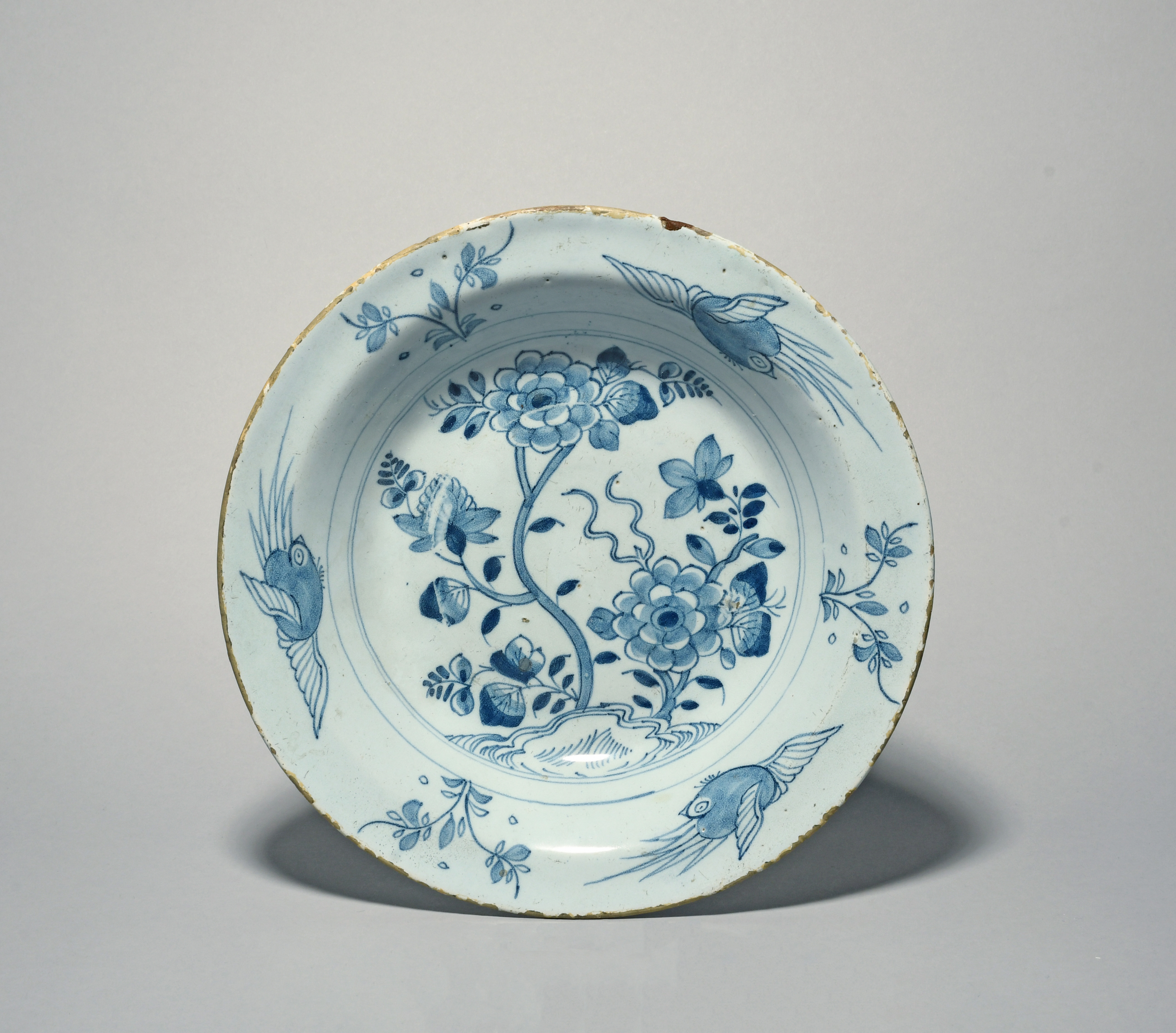 A large Liverpool delftware soup plate, mid 18th century, the well painted in blue with flowering plants, the rim with three birds in flight between leaf sprigs, some glaze chipping, 25.5cm.