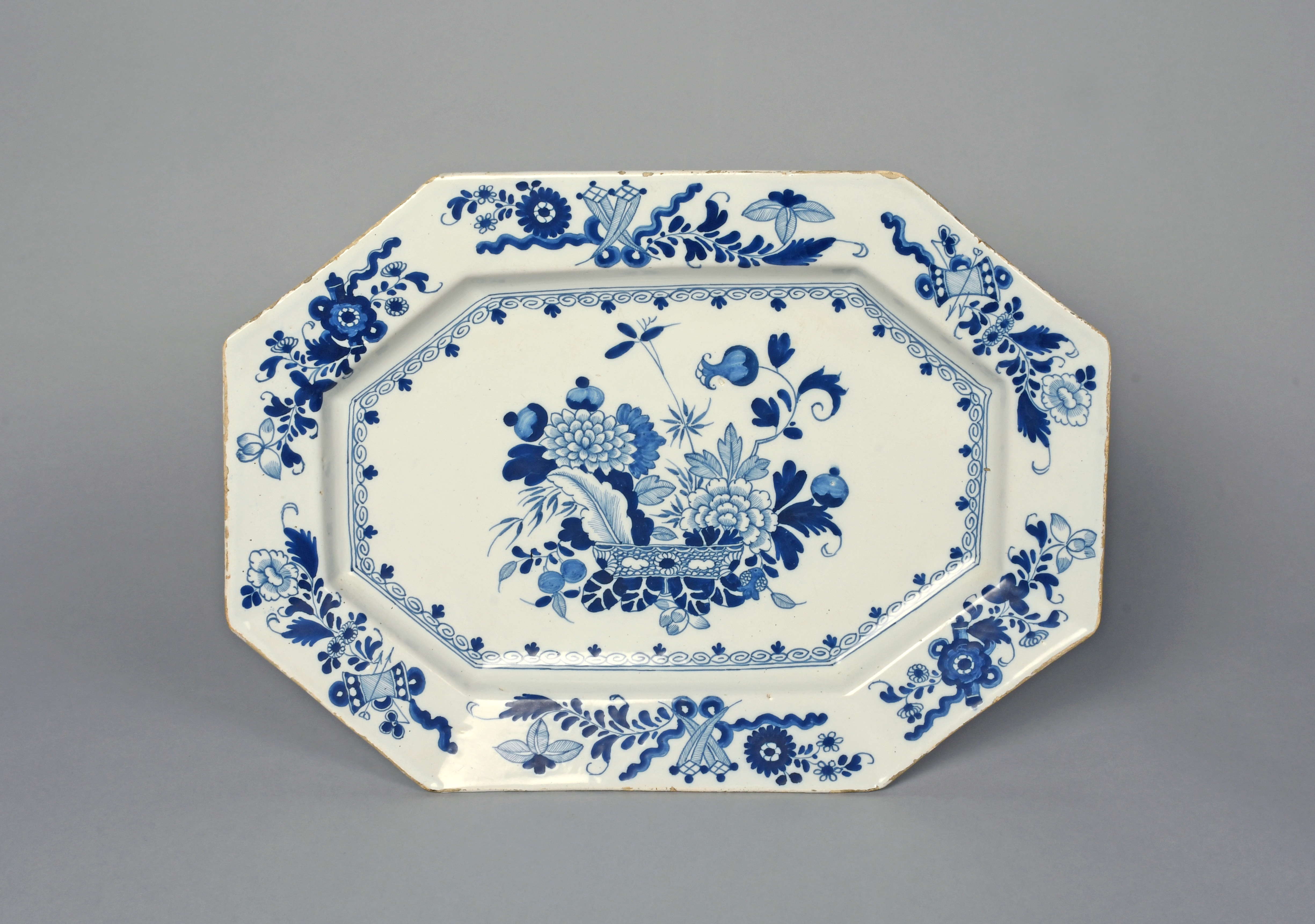 A large delftware charger, c.1760-70, probably Irish, painted in blue with a patterned censer of flowers including chrysanthemum and peony, the cavetto with a scroll border, the rim with vignettes of flowers, tied scrolls and other auspicious objects, 48.3cm.