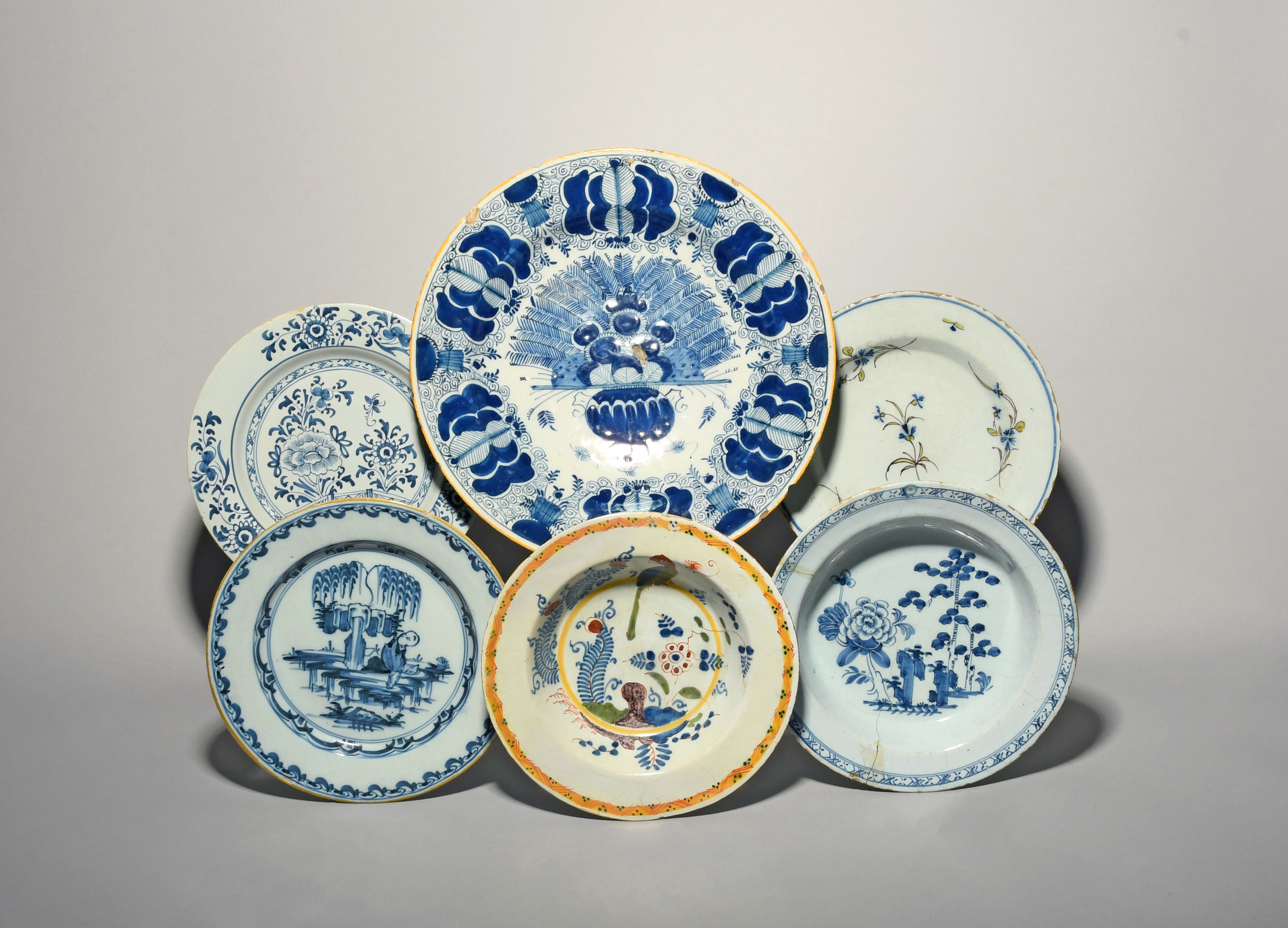 Six English and Dutch delftware plates, c.1730-70, including a polychrome soup plate with a parrot on a ring, a Dutch peacock charger, a plate and a soup plate painted with flowering branches, and a plate with a Chinese boy seated beneath willow, some damages, 32.3cm max. (6)