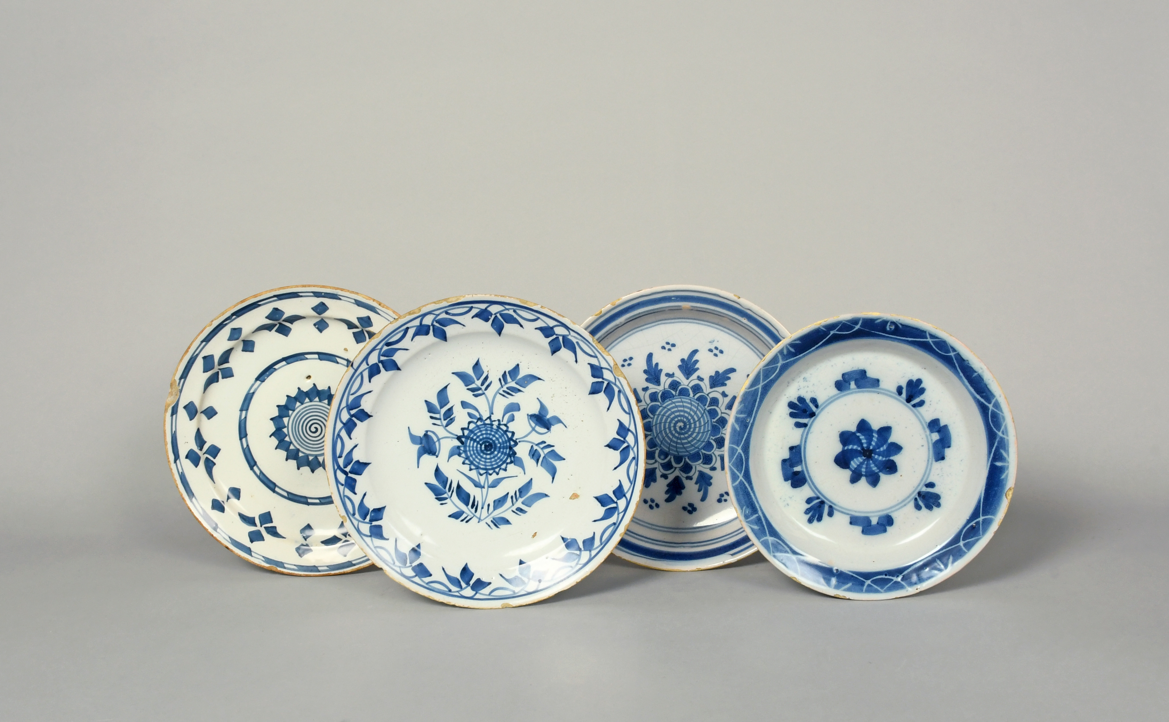 Four delftware plates, c.1720-50, variously painted in blue with stylized flowerheads and geometric motifs within formal and line borders, minor damages, 22.5cm max. (4)
