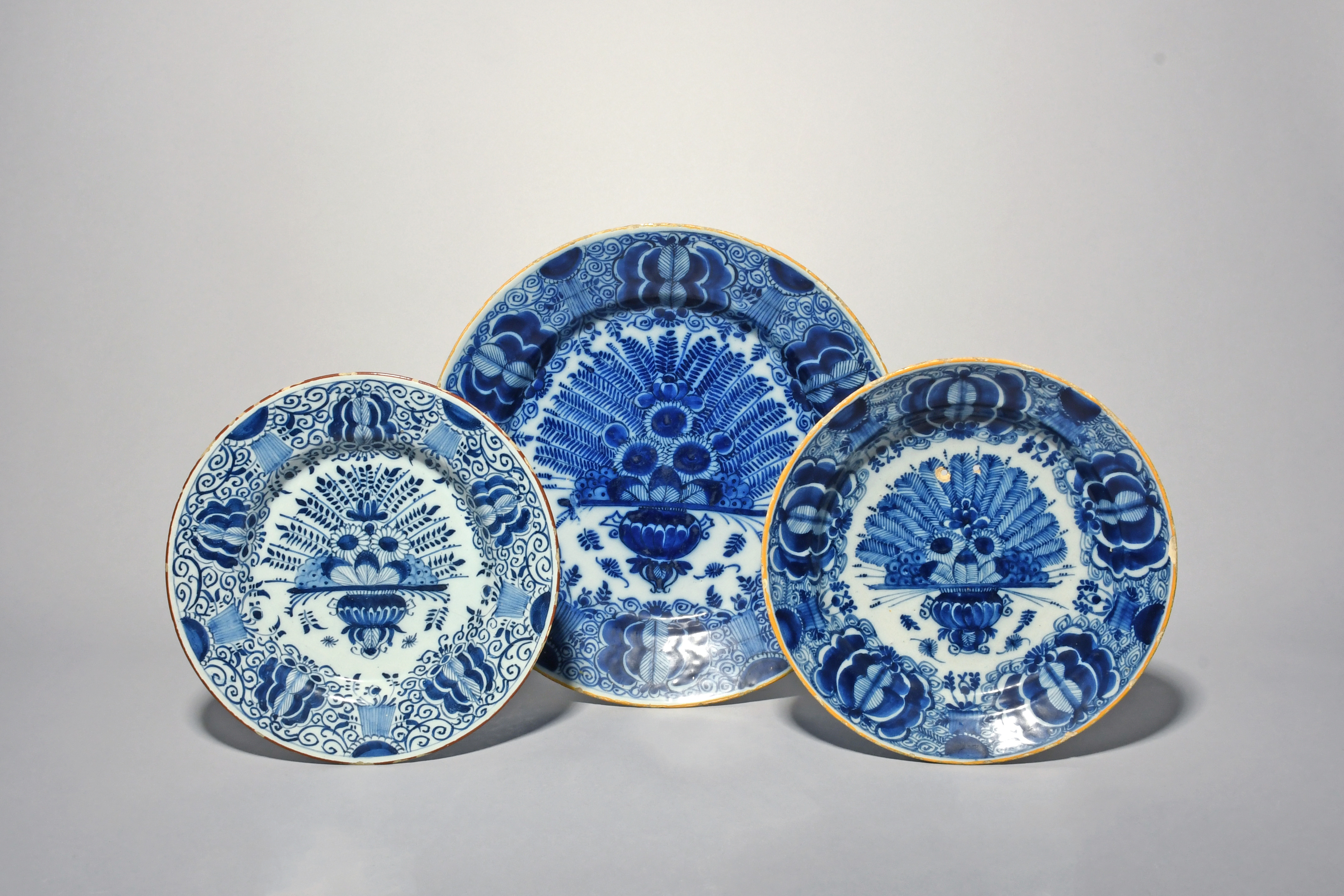 A Delft charger and two plates, 18th century, painted in blue with censers of flowers and peacock feathers, the rims with wide formal panelled designs, one plate drilled, 31cm max. (3)