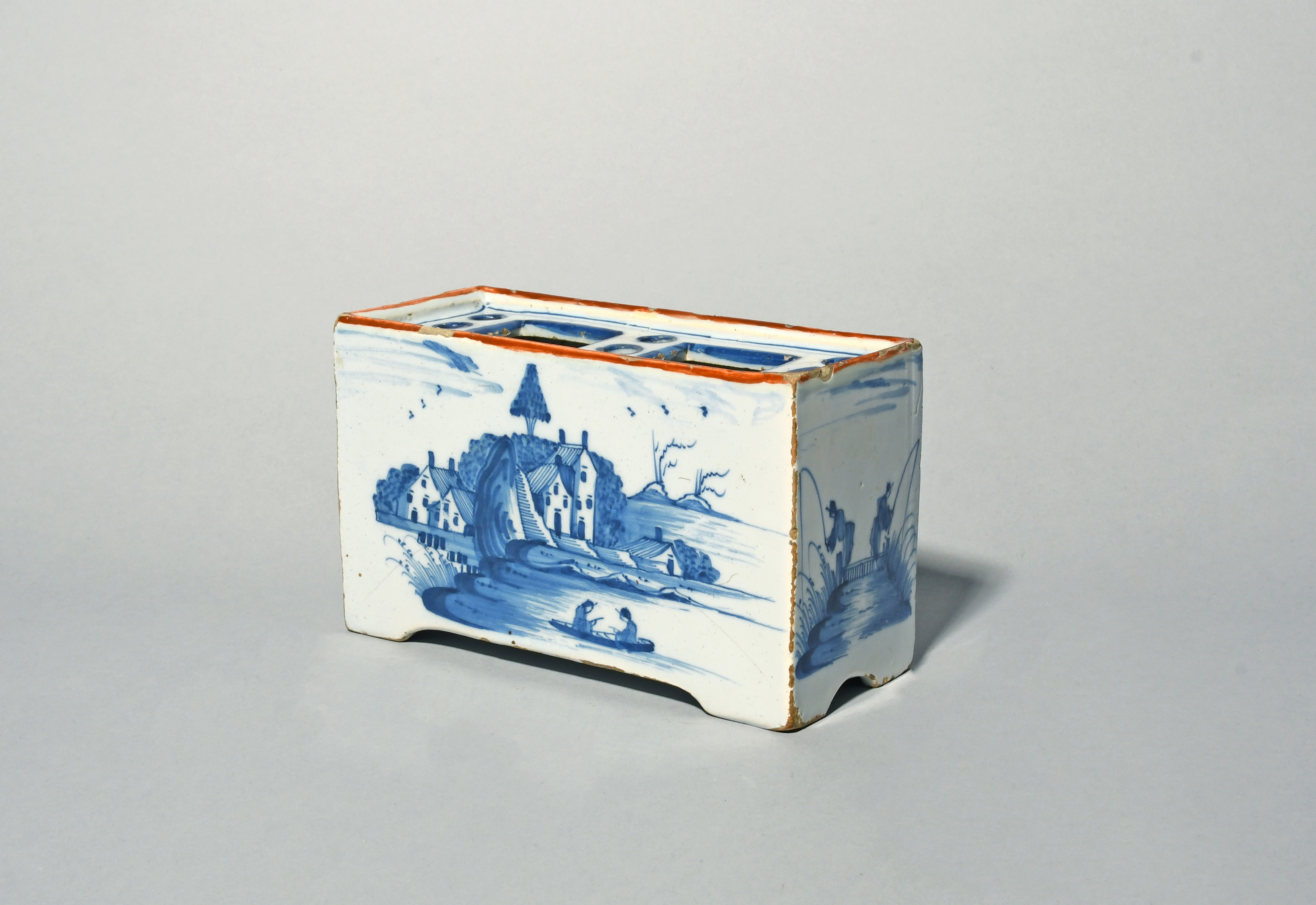 A Bristol delftware flower brick, c.1760, the rectangular form painted to the long sides with two figures in a boat before buildings and a tall tree, the short sides with two figures fishing back-to-back, the recessed top pierced with two square and nine small circular holes, a crack to the base, 15.6cm across.