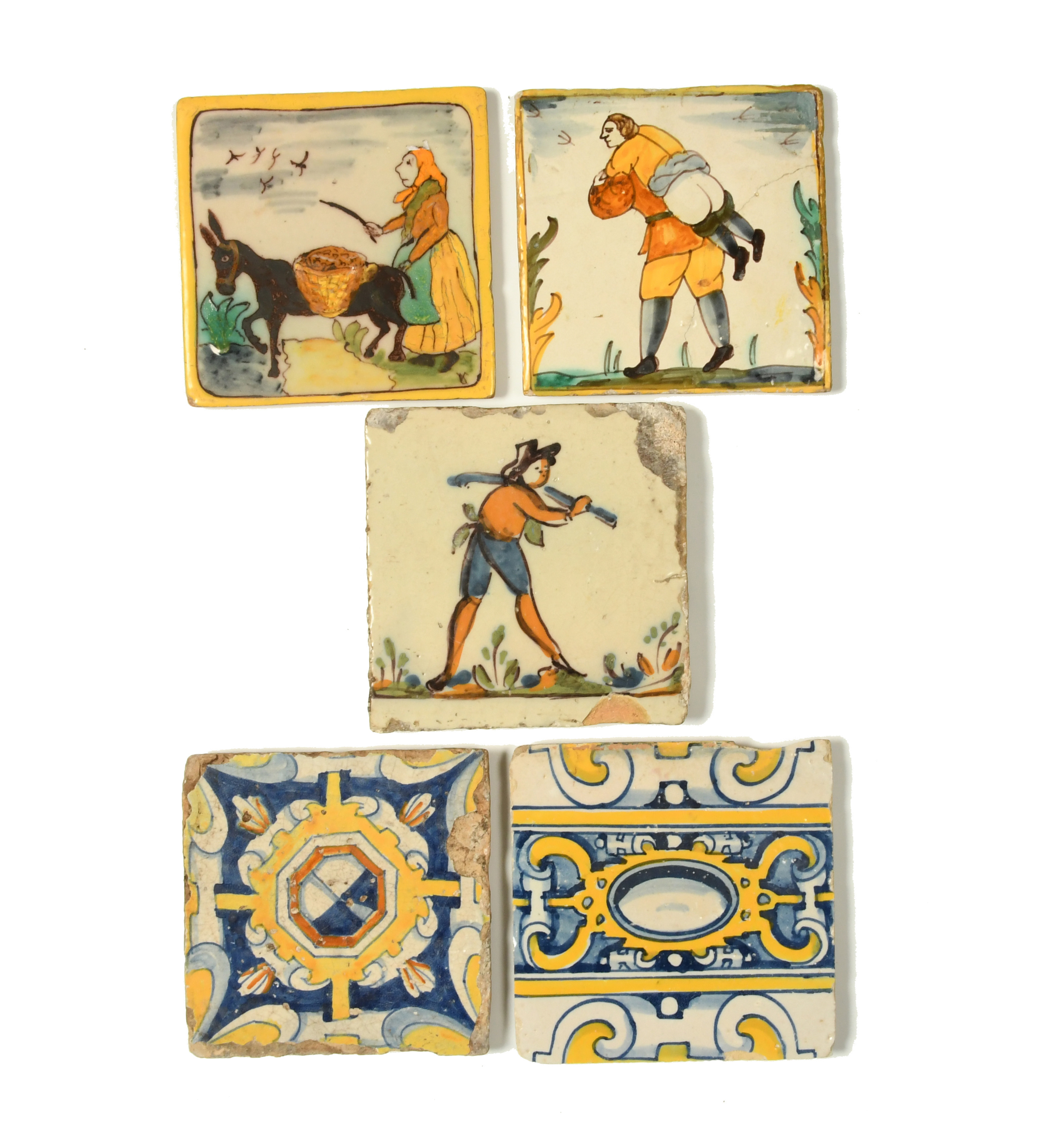Five Spanish maiolica tiles, 18th and 19th centuries, three figural and painted with a woman driving a donkey, a bare-bottomed man on the shoulders of another figure, and a man shouldering a weapon or staff, two other tiles decorated with geometric motifs in blue and yellow, some damages, 13.9cm max. (5)