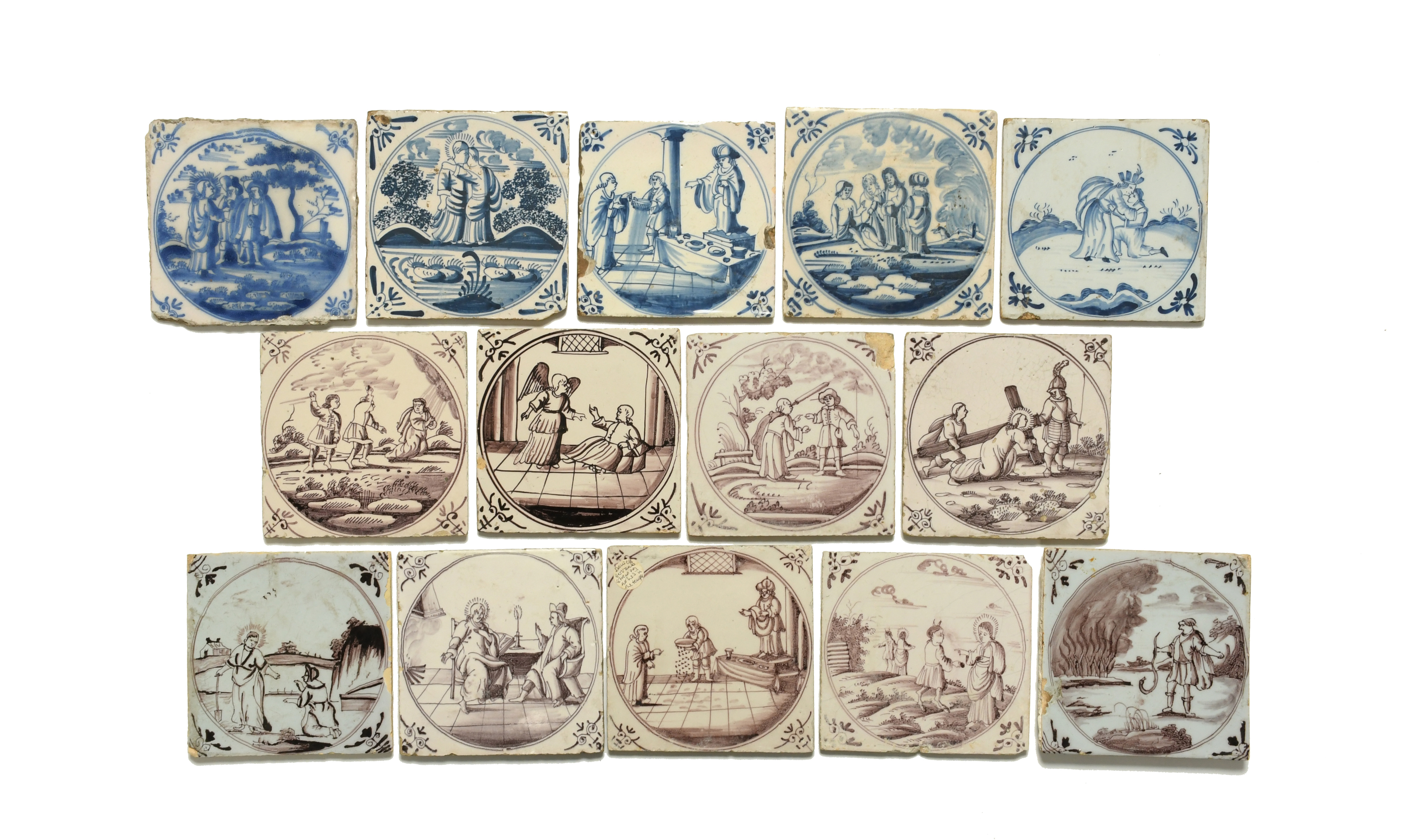 Fourteen English and Dutch delftware tiles, 18th century, painted in blue or manganese with scenes including the Stoning of Stephen, the Woman of Canaan, the Tribute Money, the Temptation in the Wilderness, the Return of the Prodigal Son, the Annunciation and Daniel Scattering Ashes in the Temple, within circular panels with stylized foliate corner motifs, some faults, 12.8cm. (14)