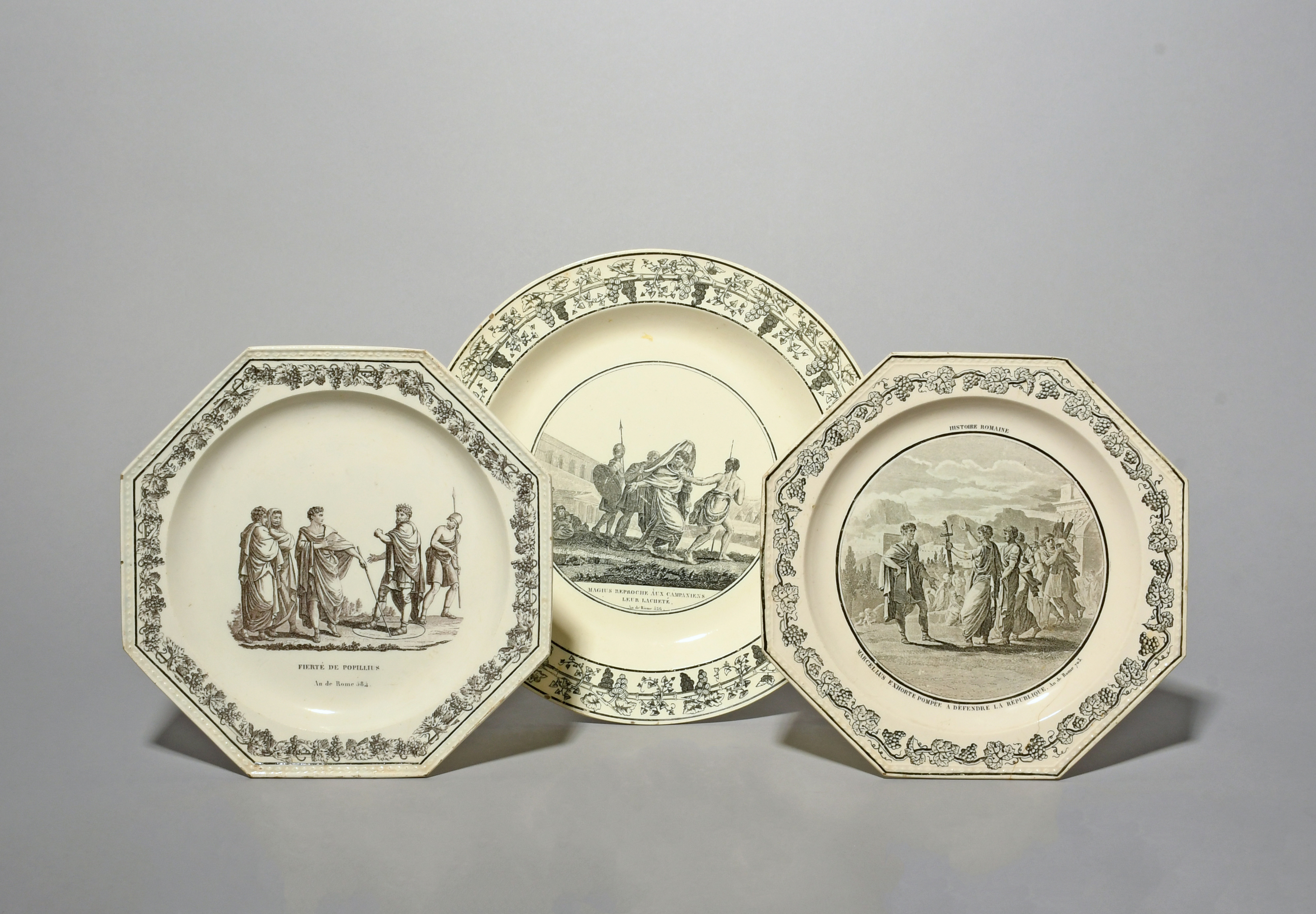 Three French creamware plates, late 18th/19th century, one Creil and printed with Magius rebuking the Campanians for their cowardice, two octagonal and printed with similar Classical scenes within grapevine borders, printed marks, 24.5cm max. (3)