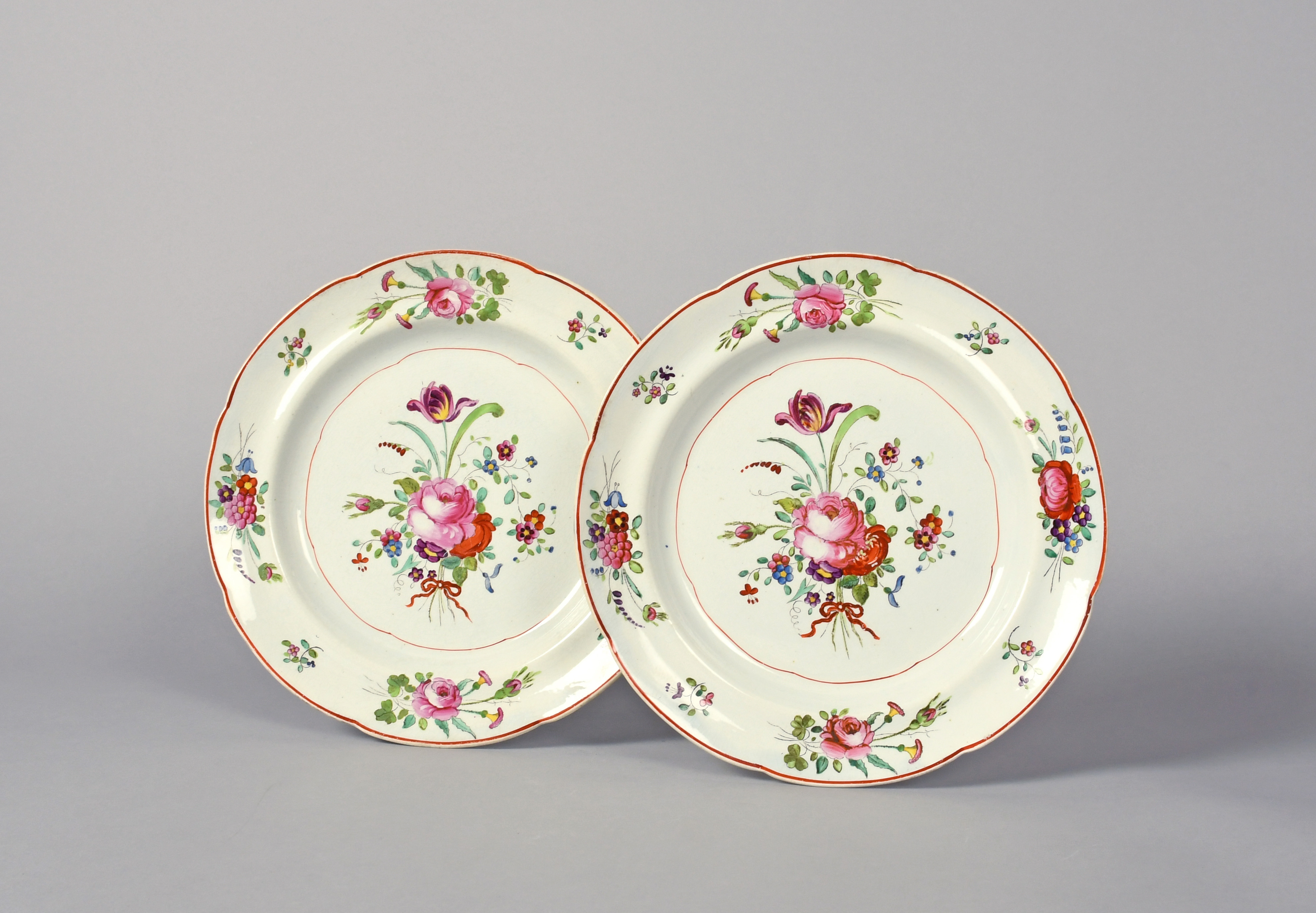 A pair of pearlware Bristol Mansion House plates, 19th century, painted with colourful flower sprays tied with a red ribbon bow, the undersides marked 'MH', 24.9cm. (2)