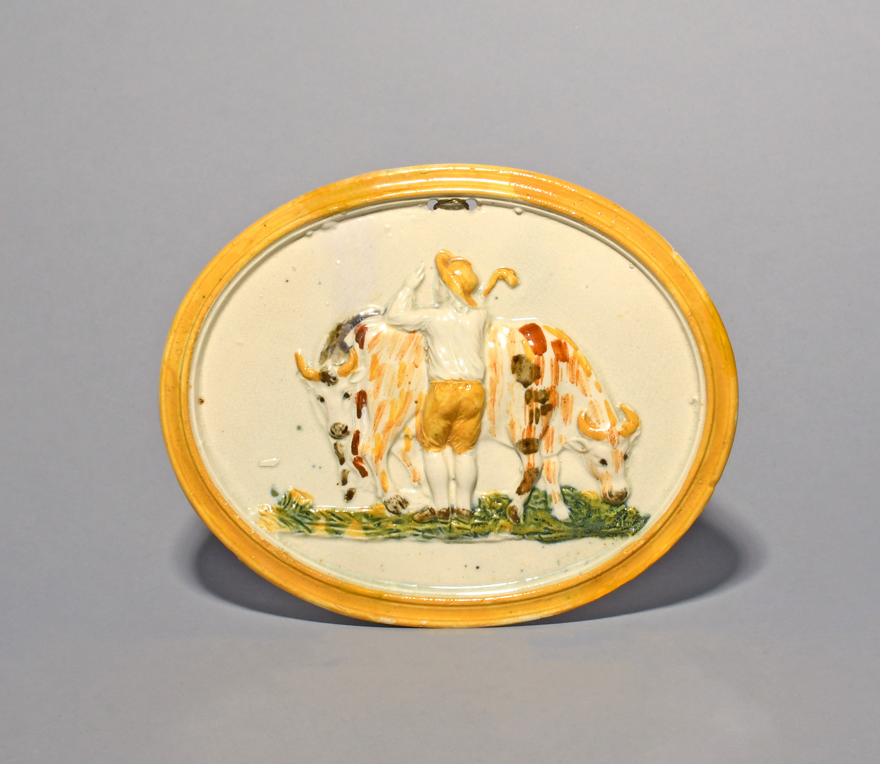 A Pratt ware oval plaque, c.1790-1800, modelled with a young cowherd attending two cattle, picked out in yellow, ochre and umber, restored crack, 18cm.