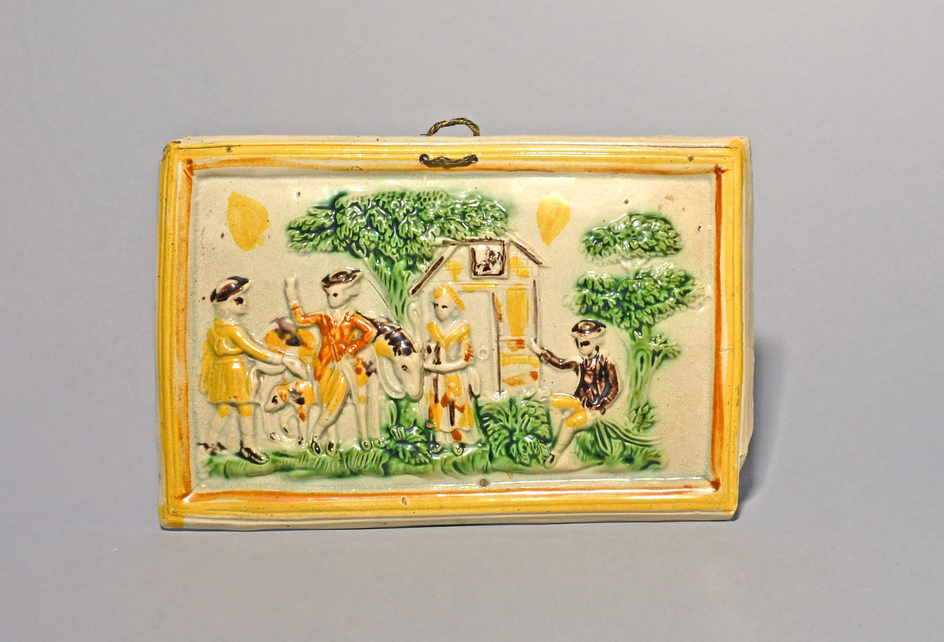 A Pratt ware rectangular plaque, c.1790-1800, moulded with a scene of huntsmen resting, with four figures, a horse and a dog outside a tavern flanked by trees, decorated in yellow, ochre, manganese and green, some chipping to the underside, 23.2cm.