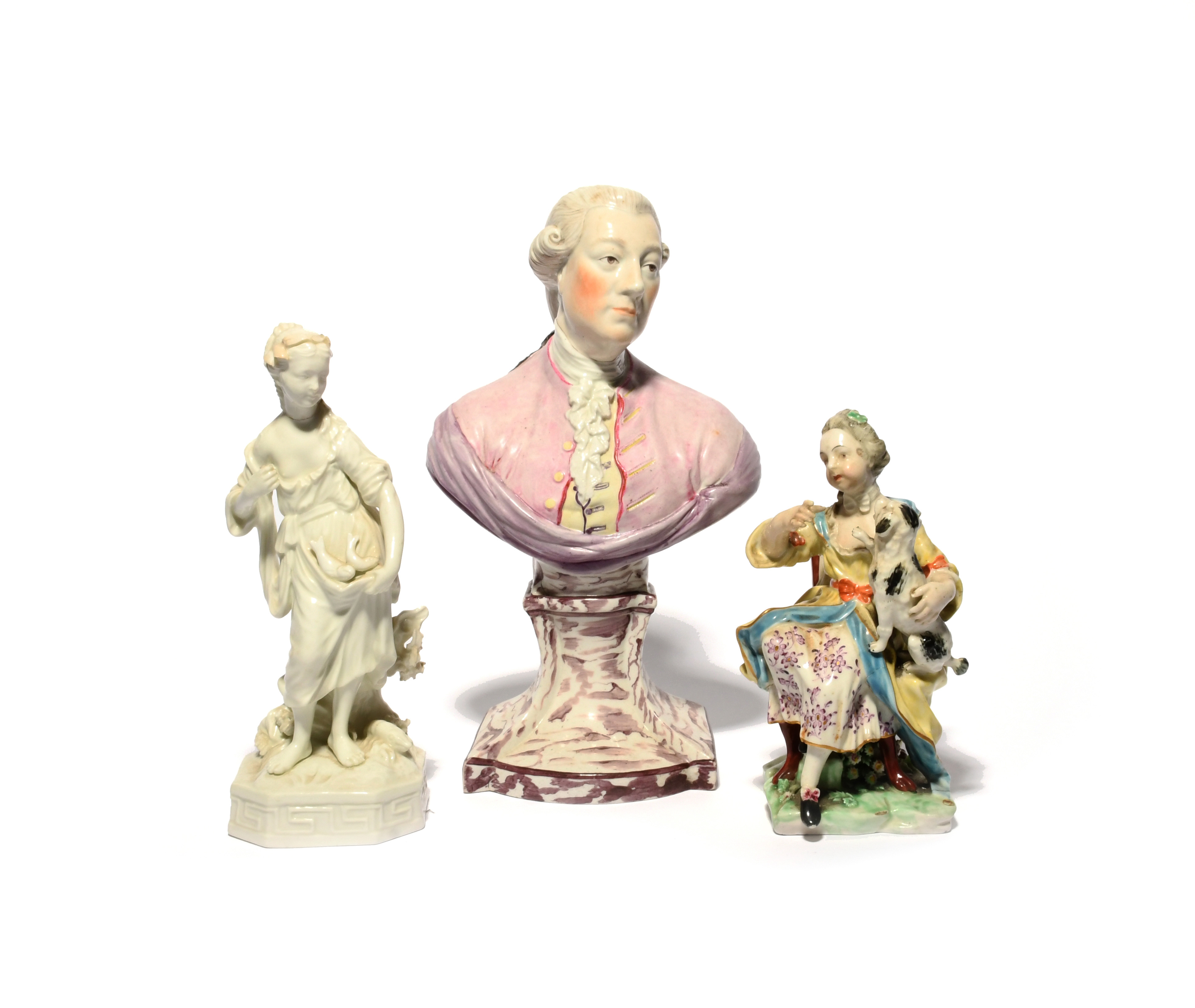 A good pearlware bust of William Pitt the Younger, c.1800, probably Enoch Wood, modelled wearing a powdered wig and with head slightly turned, raised on a faux marble socle base, together with two Derby porcelain figures of a fish seller and a girl with a dog, damages to the Derby, 22cm max. (3)