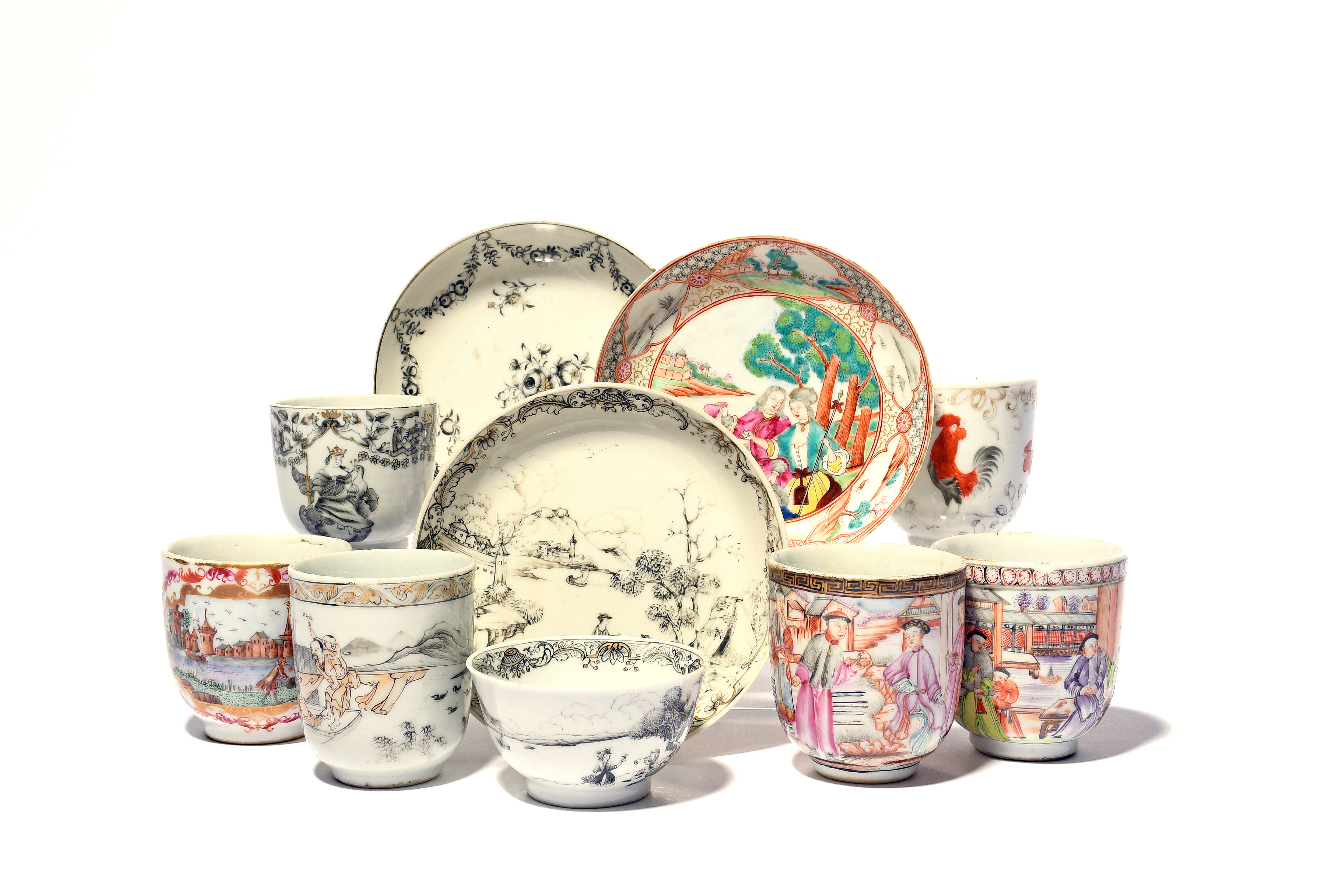 A collection of Chinese export porcelain tea and coffee wares, 18th century, some pieces possibly decorated in Europe, including a saucer brightly enamelled with figures after Bernard Picard's Pilgrims of the Island of Cythere, a teabowl and saucer with en grisaille decoration of figures, a coffee cup painted with a harbour scene after Meissen, a coffee cup with Juno, two cups with cockerels, and others with Chinese figures, small damages, 12.1cm max. (11)
