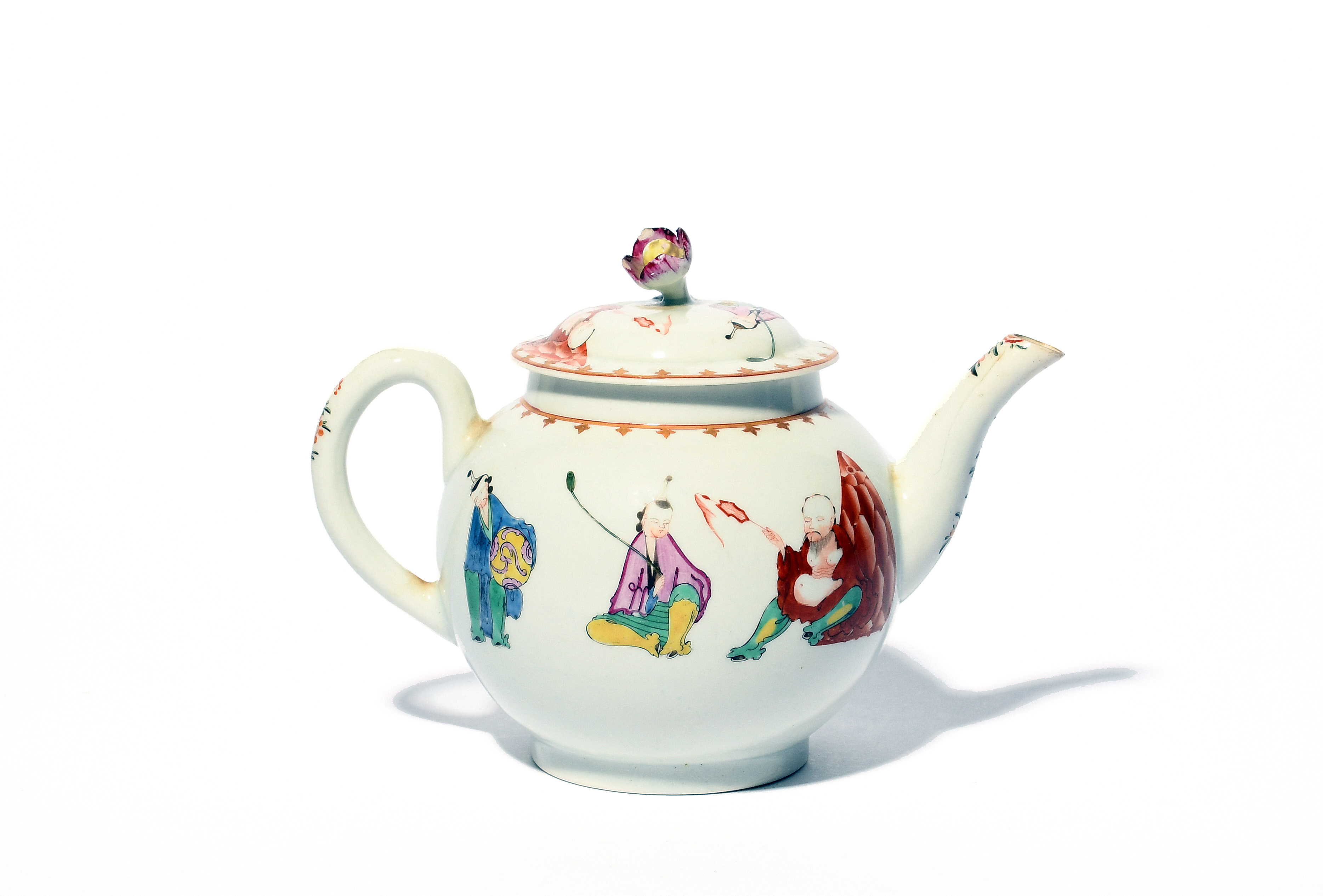 A Worcester teapot and cover, c.1760, painted with the Pu Tai or Corpulent Monk pattern, with three Chinese figures seated with varying attributes, the rim and shoulder with a gilt spearhead border, a crack to the spout, 19.2cm across. (2)