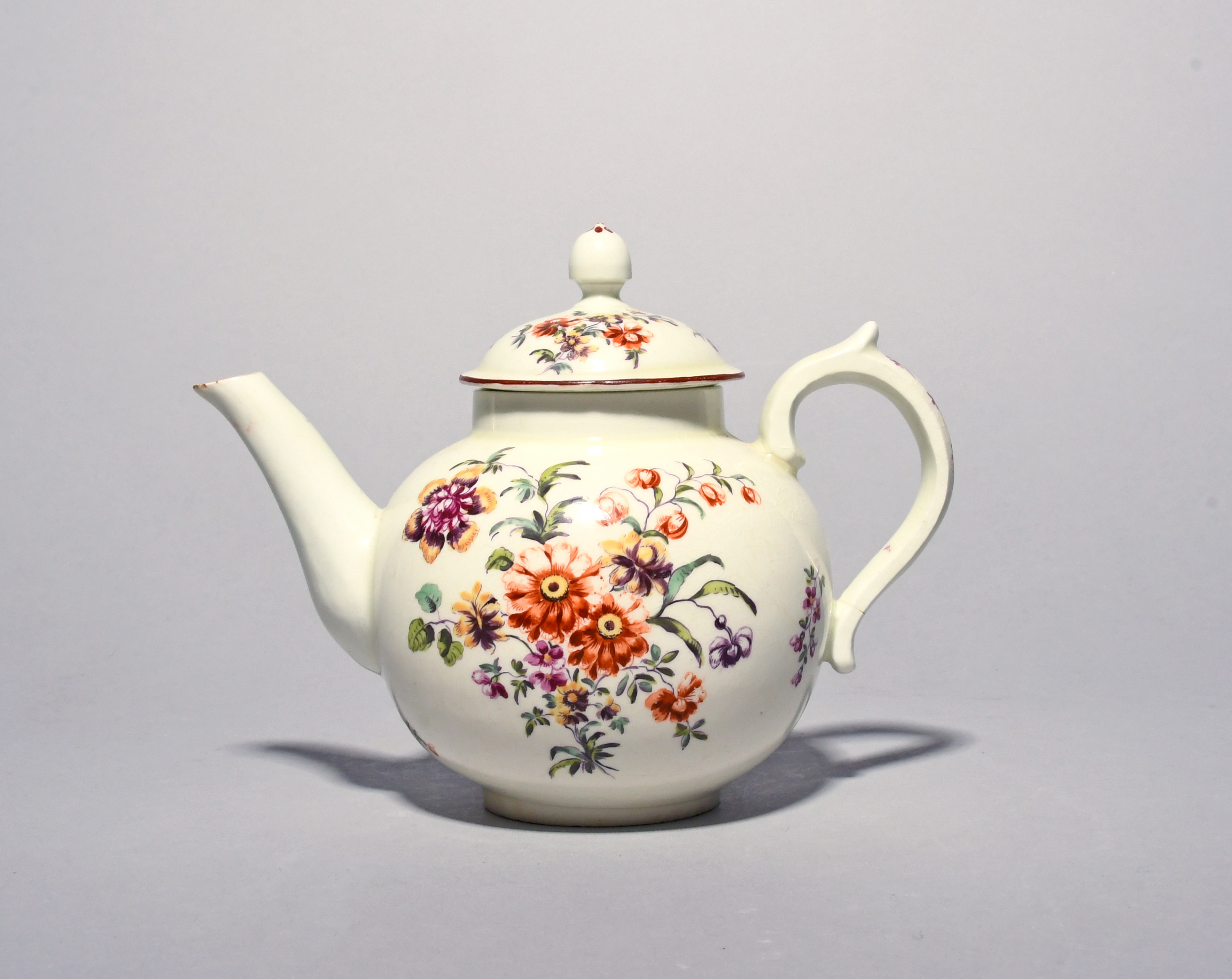 A Derby teapot and cover c.1758, well painted in the Cotton Stem manner with loose arrangements of flowers and smaller single sprigs, the handle with a formal puce motif, minor faults, 17.3cm across. (2)