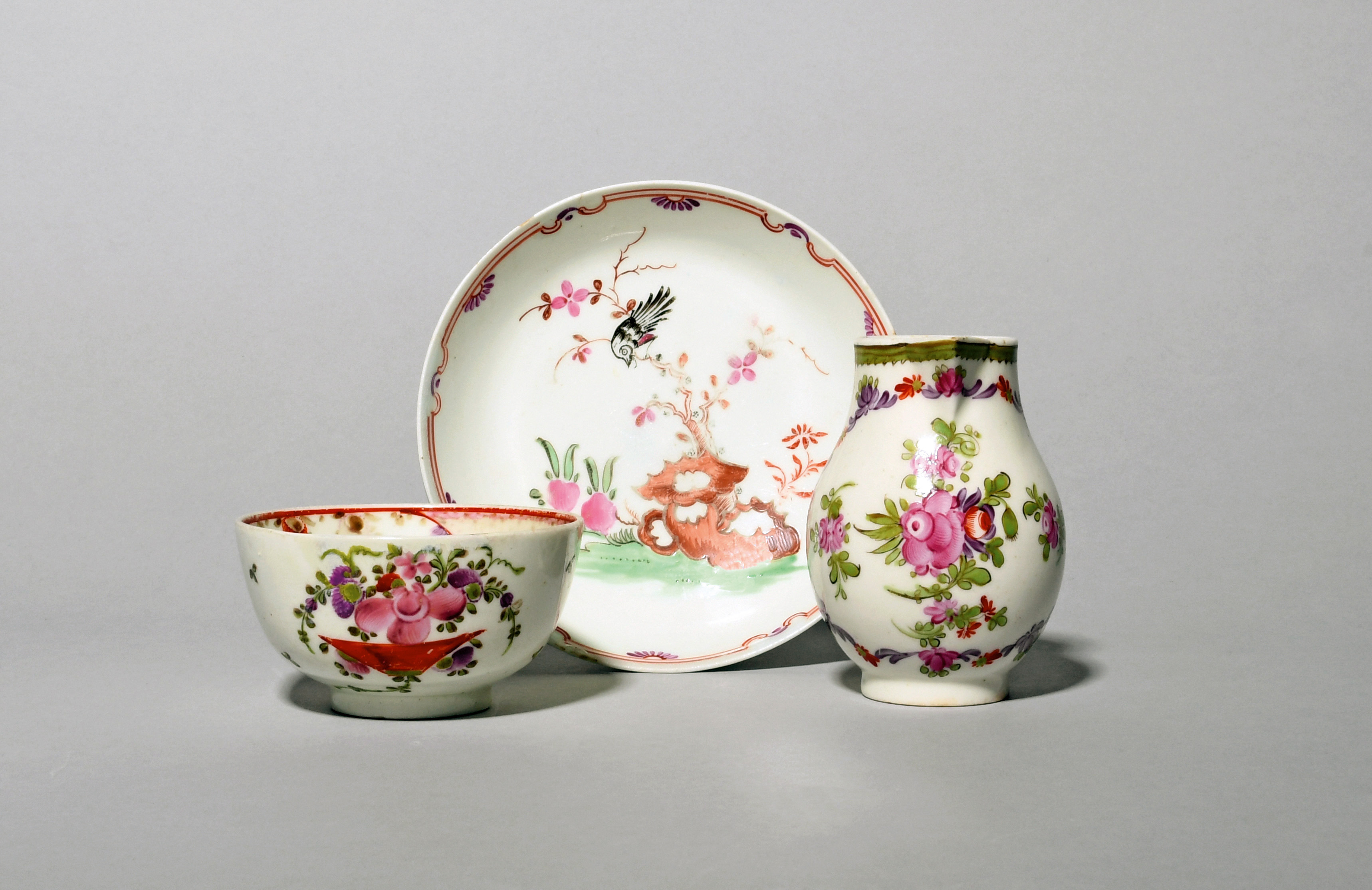 A Lowestoft saucer, c.1770, painted in polychrome enamels with the Blackbird pattern, a Lowestoft milk jug painted with stylized flower sprays within a polychrome floral border, and a teabowl painted with a simple flower basket, the interior rim with a wide scrolled border, 12.8cm max. (3)