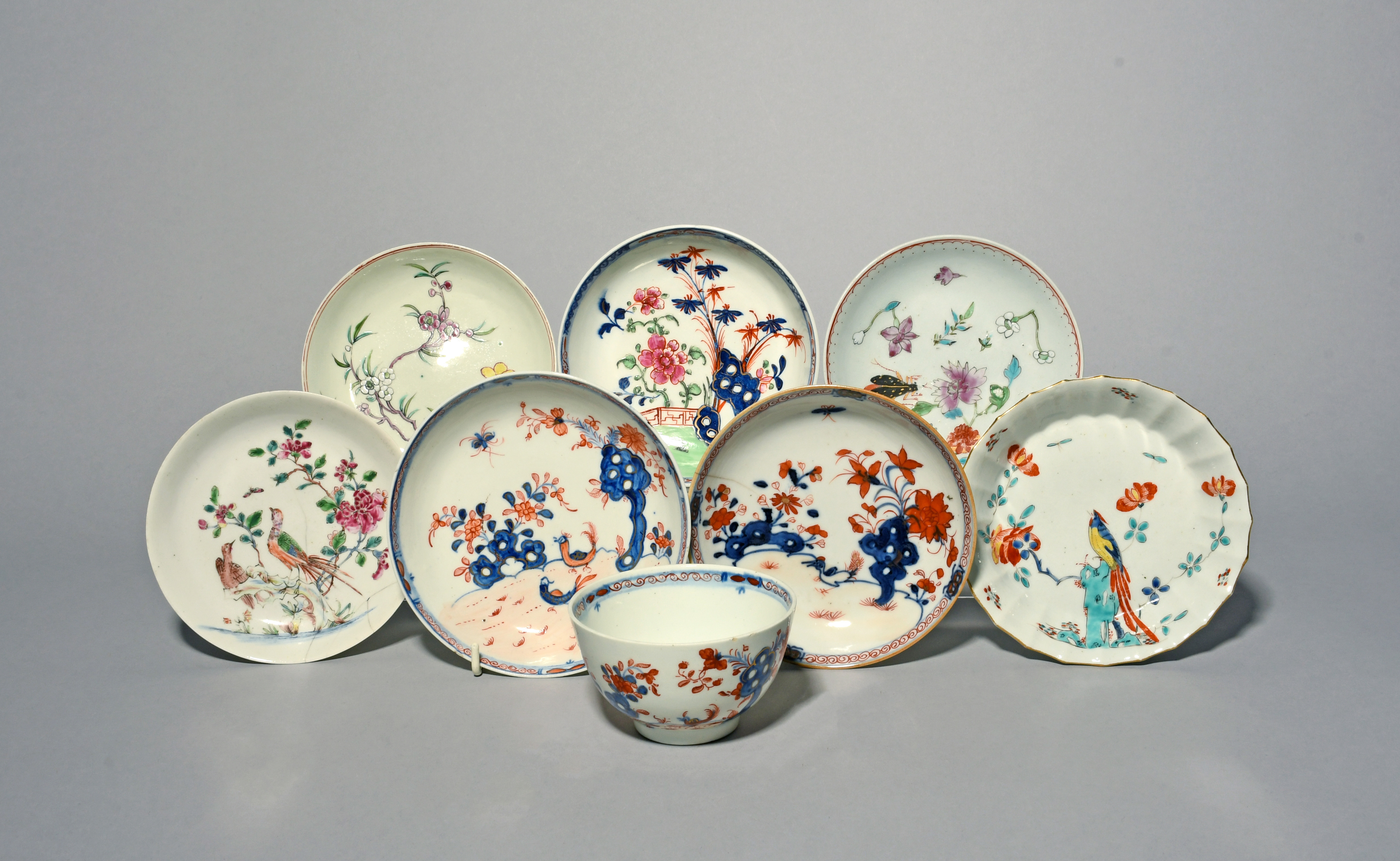 A Lowestoft teabowl and saucer and five other English porcelain saucers, c.1753-75, the teabowl and saucer painted in the Imari palette with confronting cockerels, another in polychrome enamels with flowering plants and rockwork, a Chinese saucer with similar Imari decoration, an early Worcester saucer painted with long-tailed pheasants beside peony, another in the Sir Joshua Reynolds pattern, another in the Astley or Harvest Bug pattern, and a Liverpool saucer painted with flowering branches, some faults, 12.8cm max. (8)