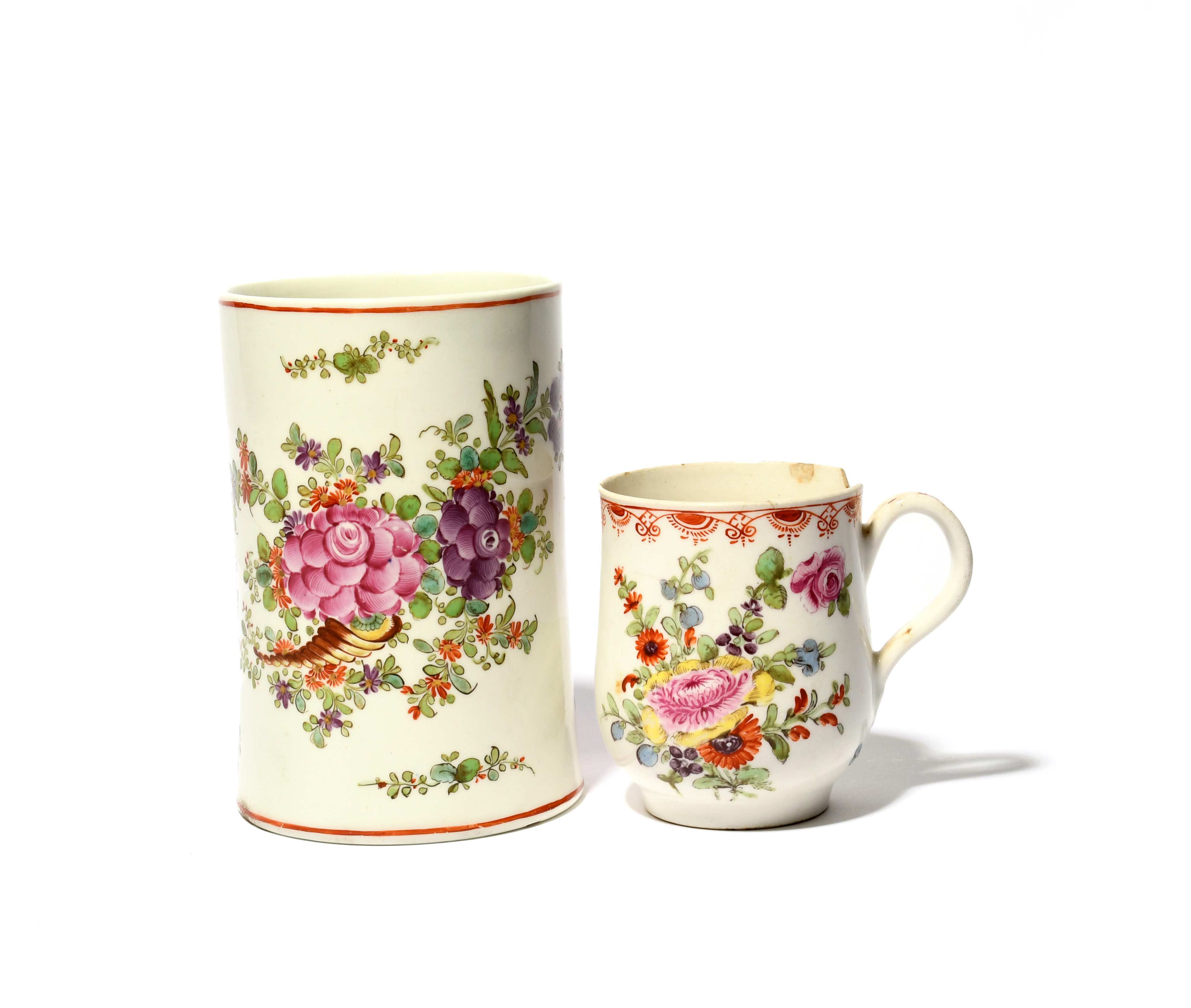 A tall Lowestoft mug, c.1785, painted in the Curtis manner with a cornucopia of flowers and foliage, around the handle with panels of scrolling red foliage enclosing polychrome sprigs, and a small Bow mug with polychrome flowers beneath an iron red scroll border, the Bow with damage to the rim, 14.8cm max. (2)