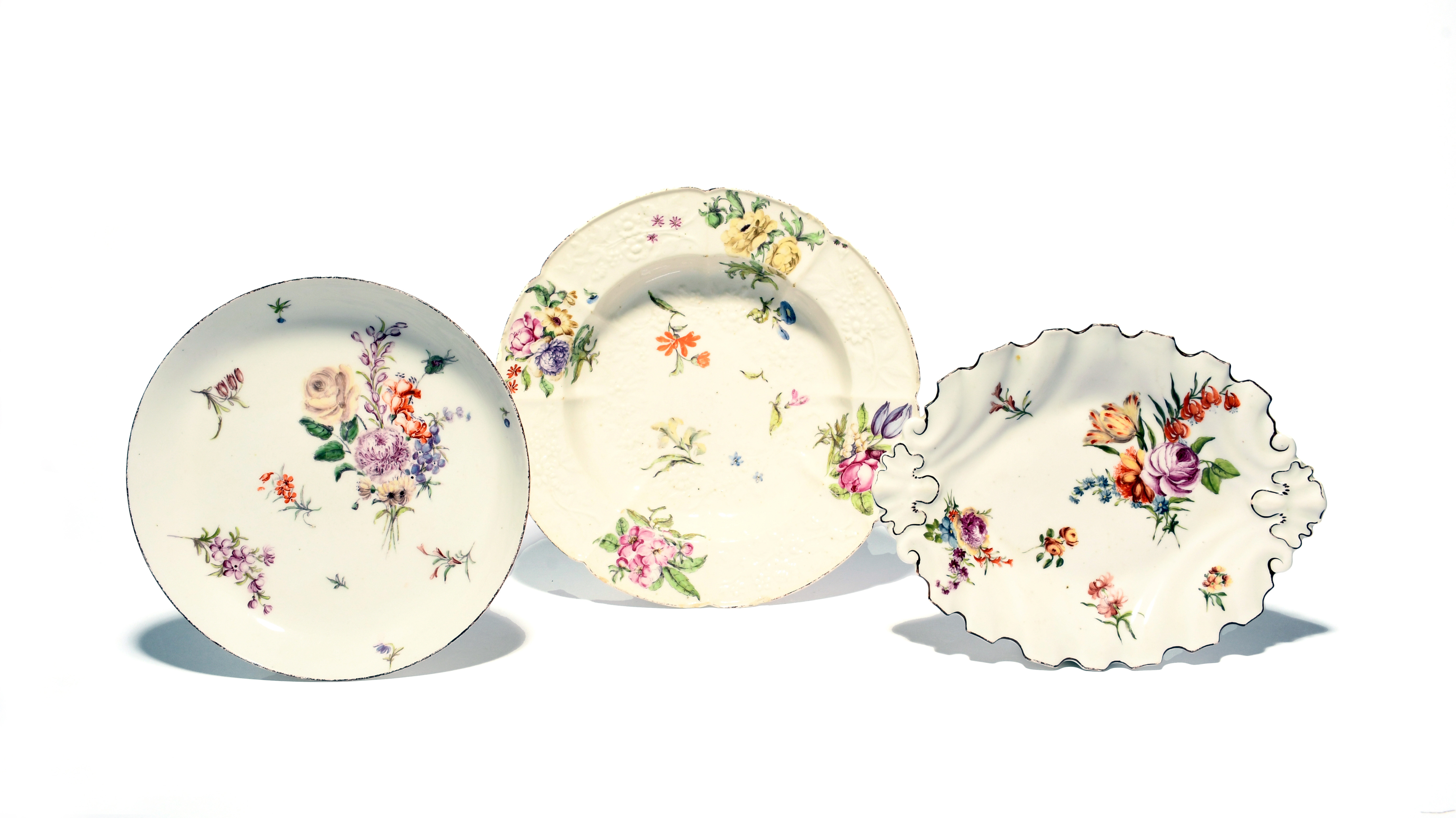 Three Chelsea plates or dishes, c.1753-56, one a soup plate with Gotzkowsky moulding after Meissen, well painted with flower sprays, one of silver-shape and painted with flower sprays within a brown line rim, the last a saucer dish with similar floral decoration, red anchor marks, minor faults, 23.8cm max. (3)