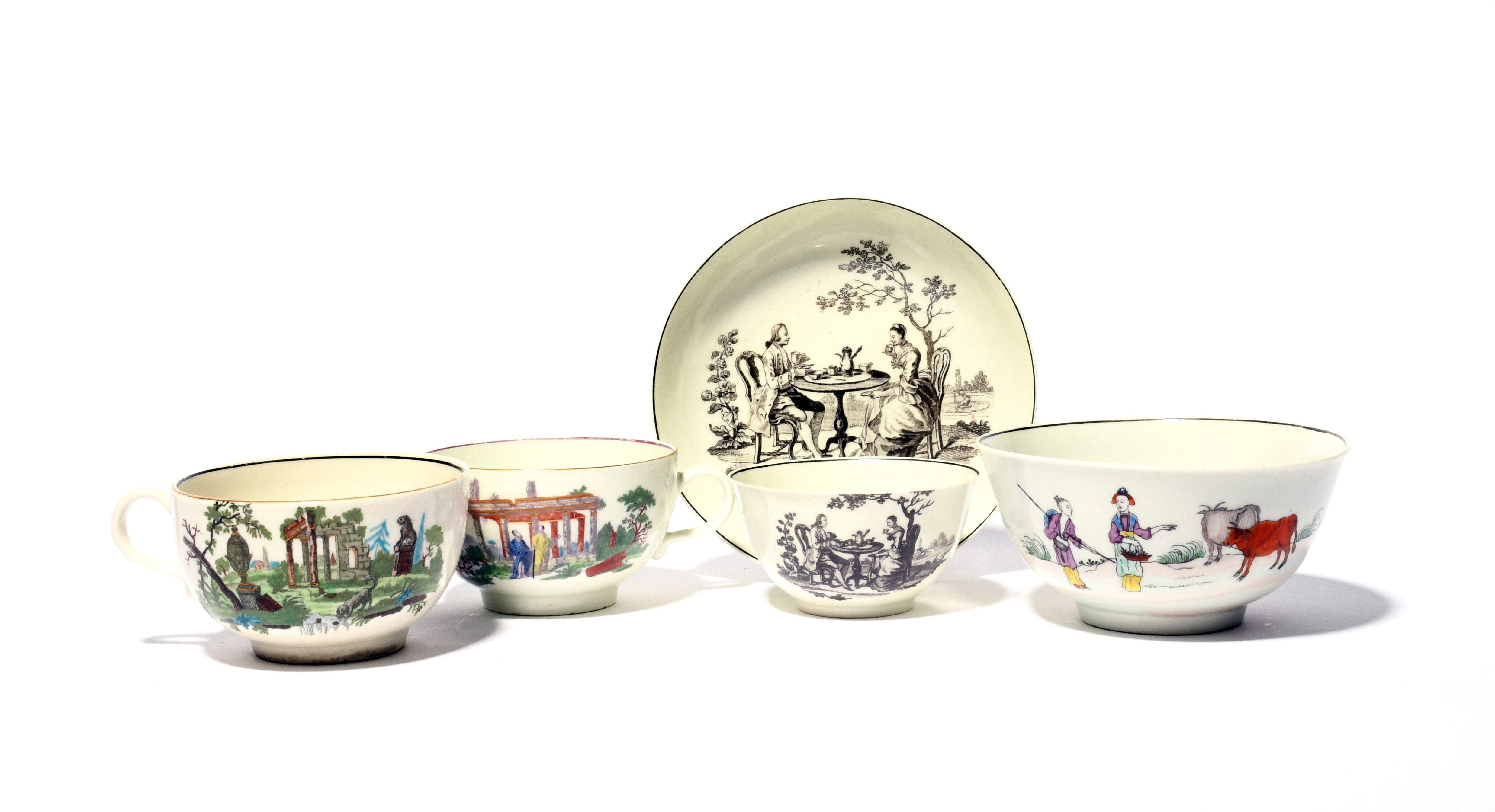 A Worcester teabowl and saucer, c.1756-60, printed in black with the Tea Party No. 3 pattern, a small Worcester bowl printed and coloured with the Red Bull pattern, and two tea cups printed and later enamelled with figures before Classical ruins, crossed swords and 9 marks to the cups, 12.2cm max. (5)