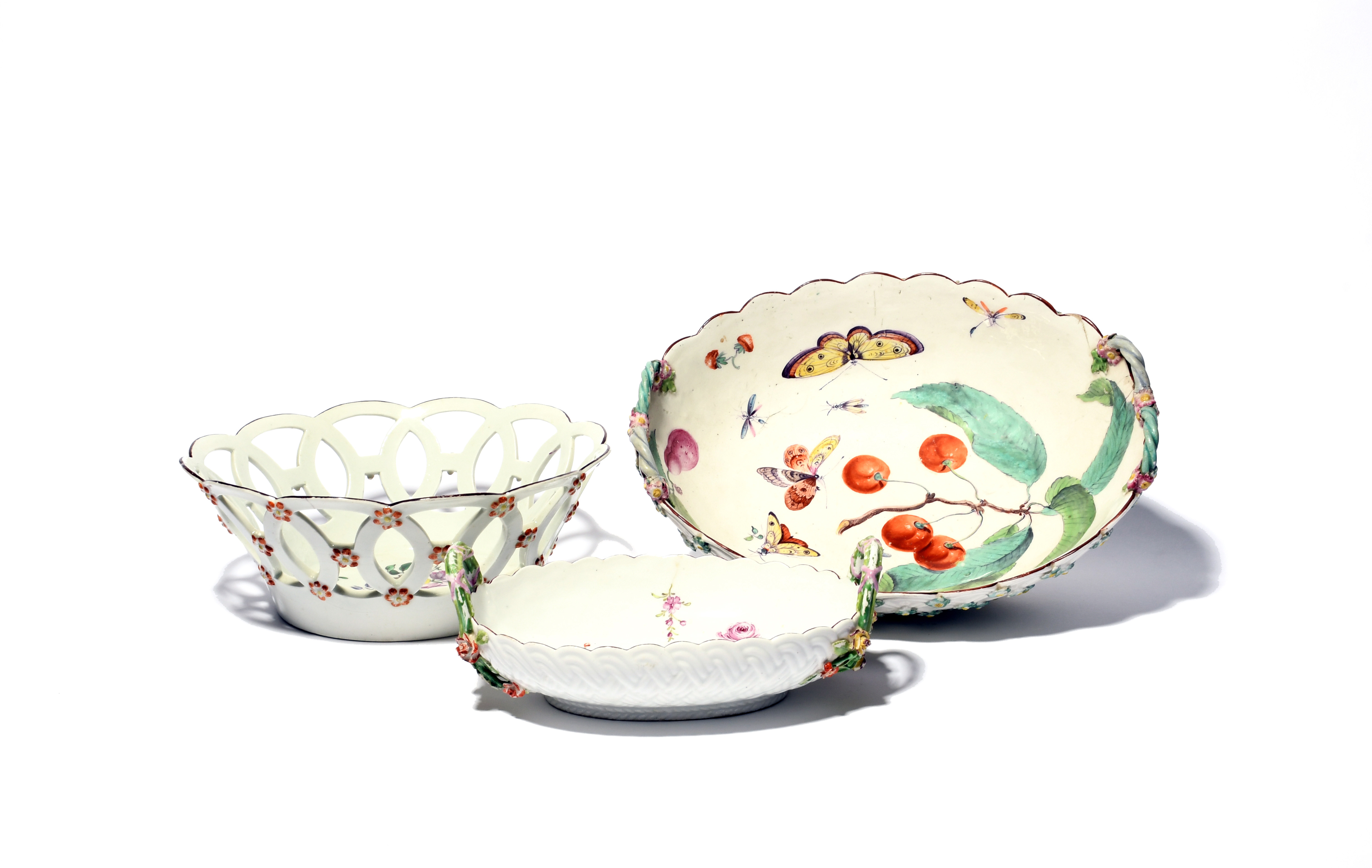 Three English porcelain baskets, c.1755-60, one Derby of oval form and boldly painted with moths around a fruiting cherry branch, another Chelsea and painted with sprays of flowers to the interior, the last a circular Worcester example painted with flowers and a flying insect, the sides applied with individual flowerheads, some damages and restorations, 28.5cm max. (3)