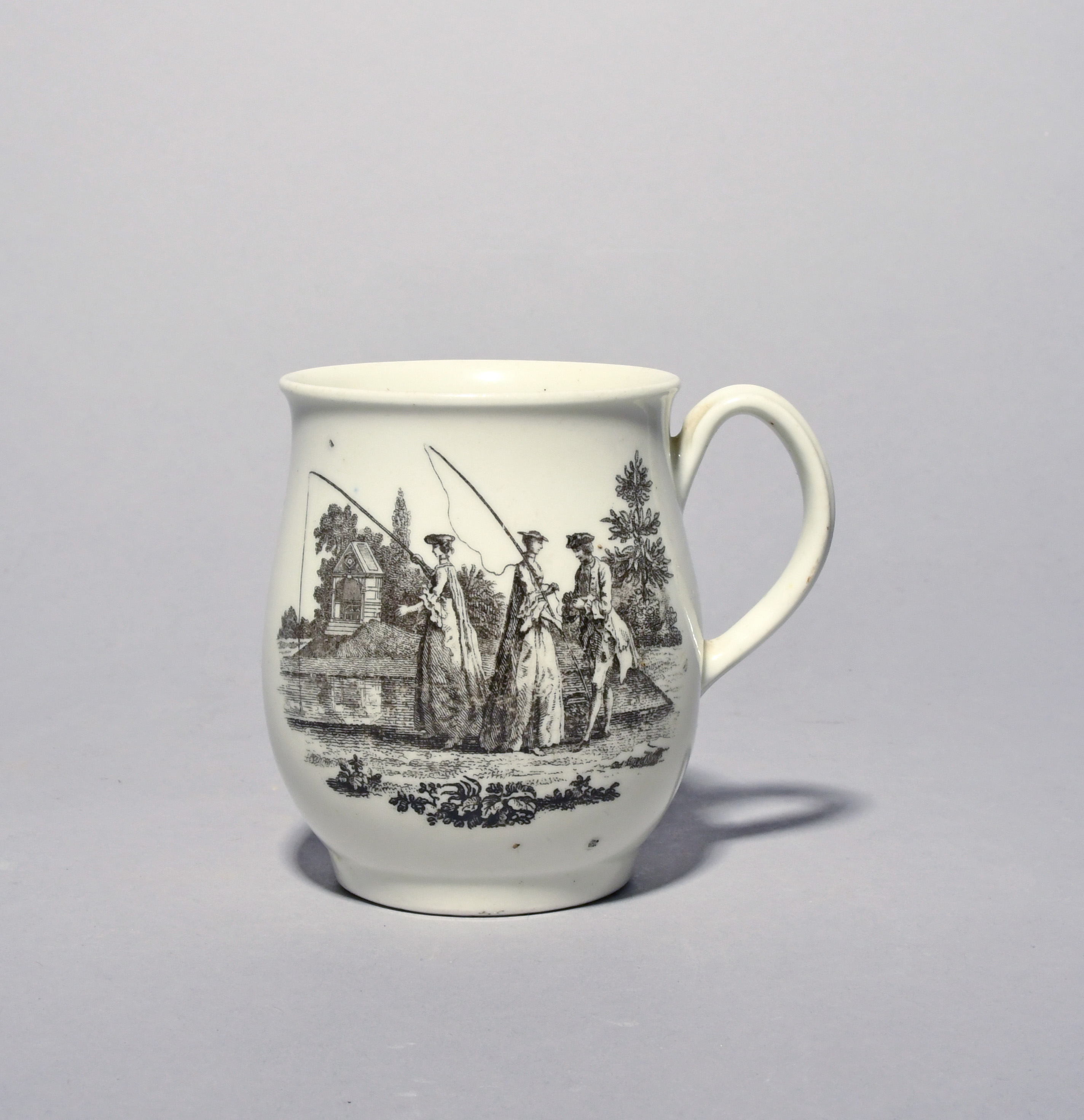 A Worcester bell-shaped mug c.1760, printed in black with The Whitton Anglers, depicting two ladies fishing in an ornamental lake, the reverse with a Milking Scene, small footrim chips, 8.7cm.