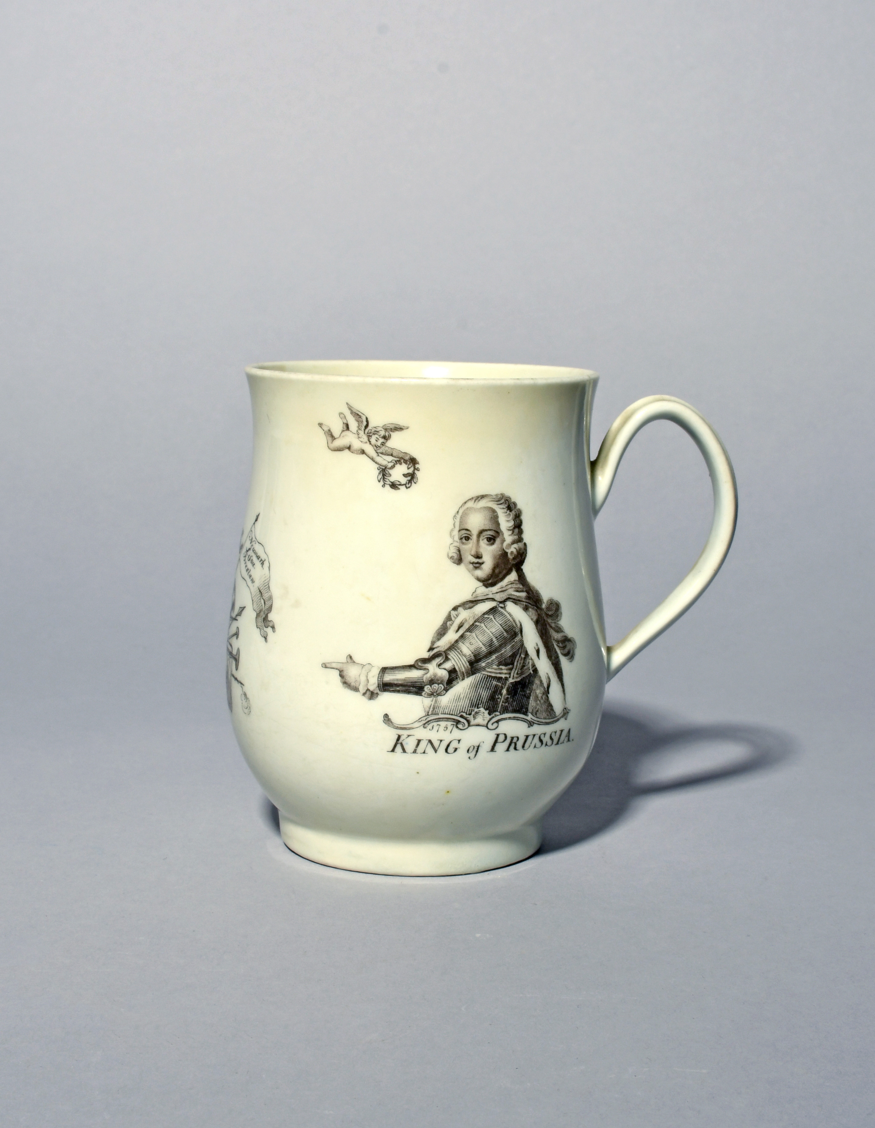 A Worcester bell-shaped King of Prussia mug, c.1757, printed in black with a head and shoulders portrait of Frederick II of Prussia, titled and dated 1757, the reverse printed with Fame blowing trumpets, both flanking a design of pennants and military trophies, signed in the print 'RH Worcester' for Robert Hancock and with an anchor rebus for Richard Holdship, 12cm.