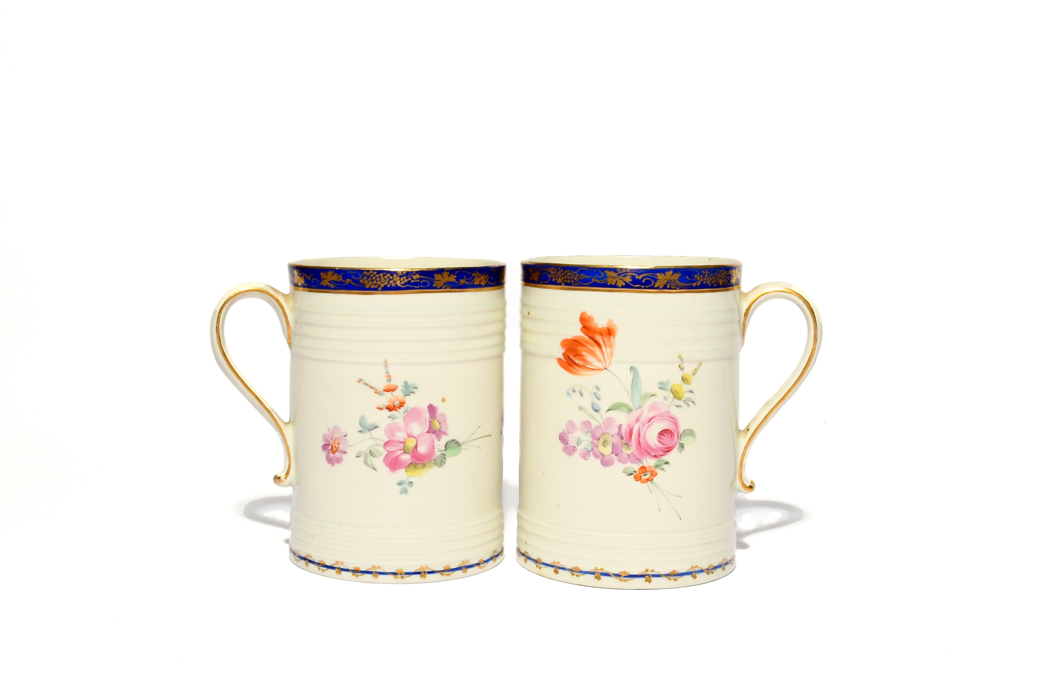 A pair of Chelsea-Derby glass-bottomed mugs, c.1770, painted in the Withers style with flowers arrangements including rose, tulip and auricula, moulded with horizontal bands, the rims with gilt grapevine borders on a blue ground, 12.6cm. (2)