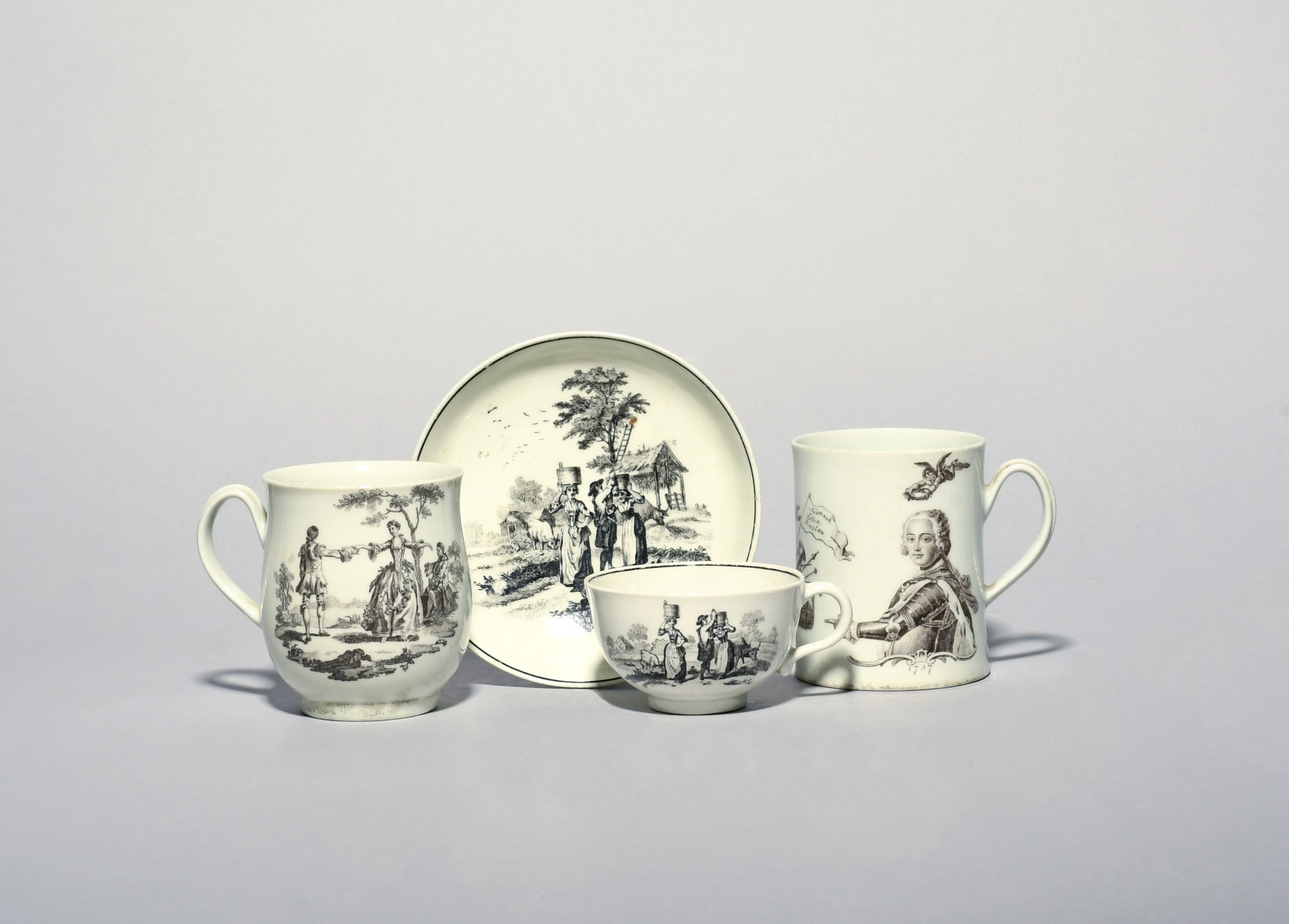 Two small Worcester mugs, c.1757-60, one printed in black with the King of Prussia beside victory motifs, the other bell-shaped and printed with The Minuet and The Haymakers, and a Worcester teacup and saucer printed with The Milkmaids, 13.1cm max. (4)