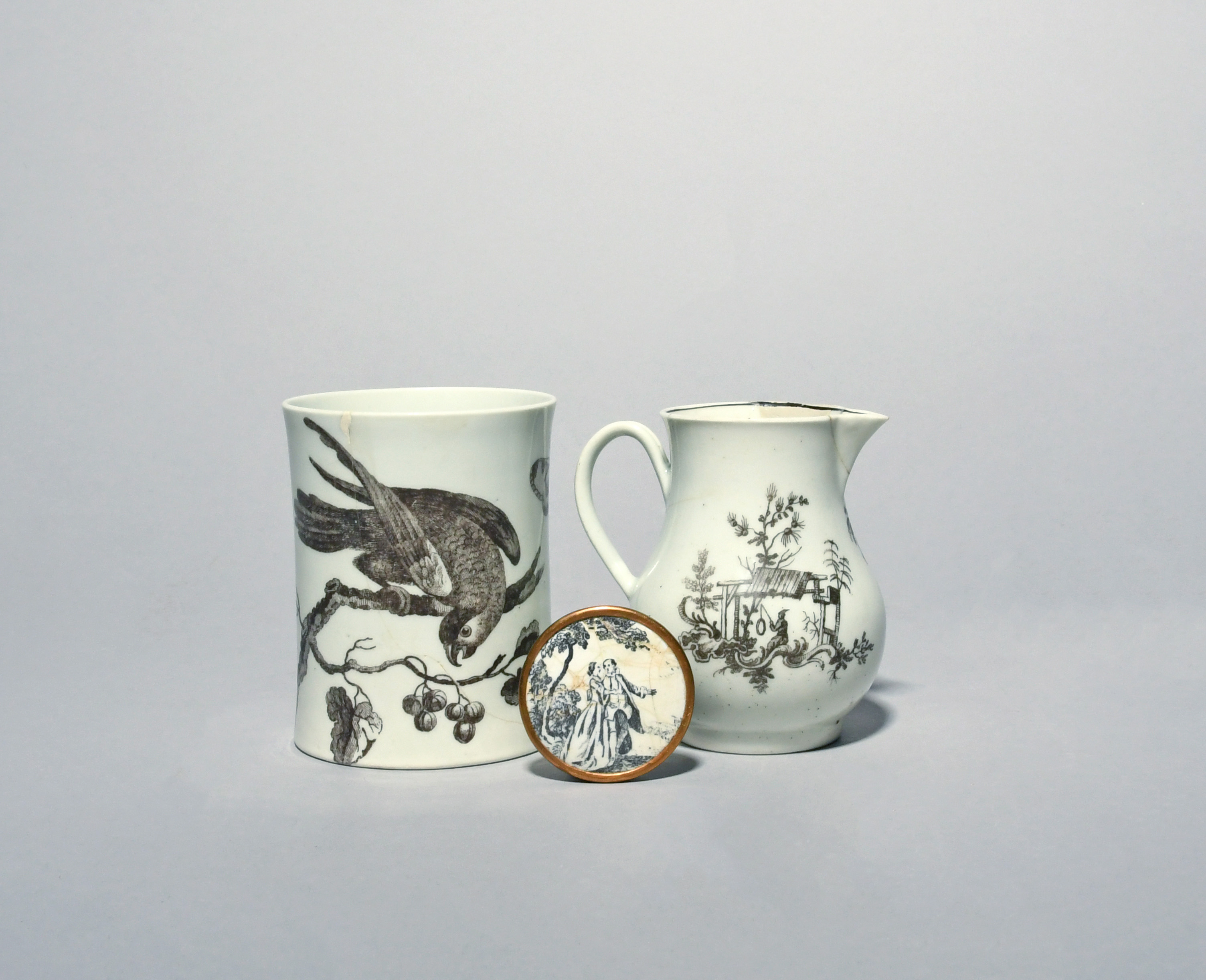 A Worcester cream jug c.1756, printed in black with Les Garçons Chinois pattern, a small cylindrical mug printed with the Parrot Pecking Fruit pattern, signed 'Rbt Hancock fecit' within the lower branch, and a large Birmingham enamel circular button printed in black with a gallant and his companion, damages, 8.7cm max. (3)