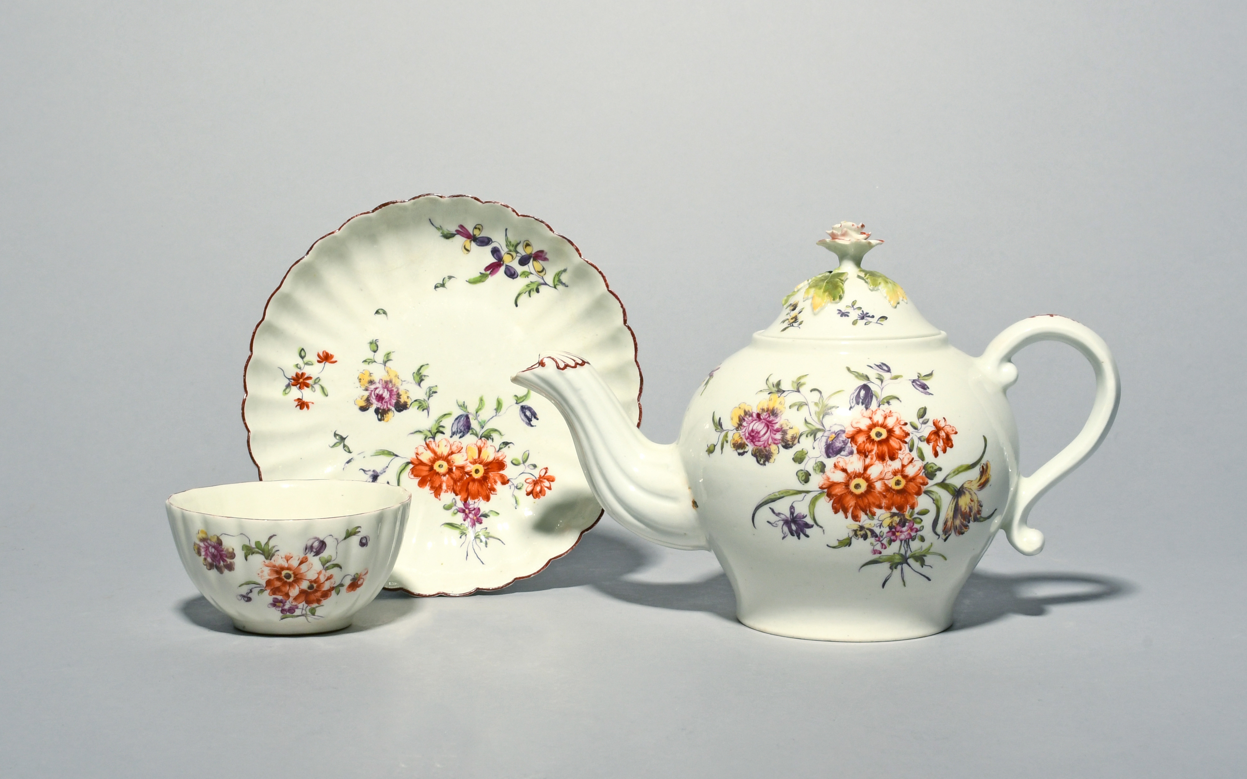 An early Derby teapot and cover c.1756-58, painted in the Cotton Stem manner with loose flower sprays, the reverse with a branch of honeysuckle, with scroll handle and reeded spout, and a fluted teabowl and saucer painted with the same design, minor faults, 19.6cm max. (4)