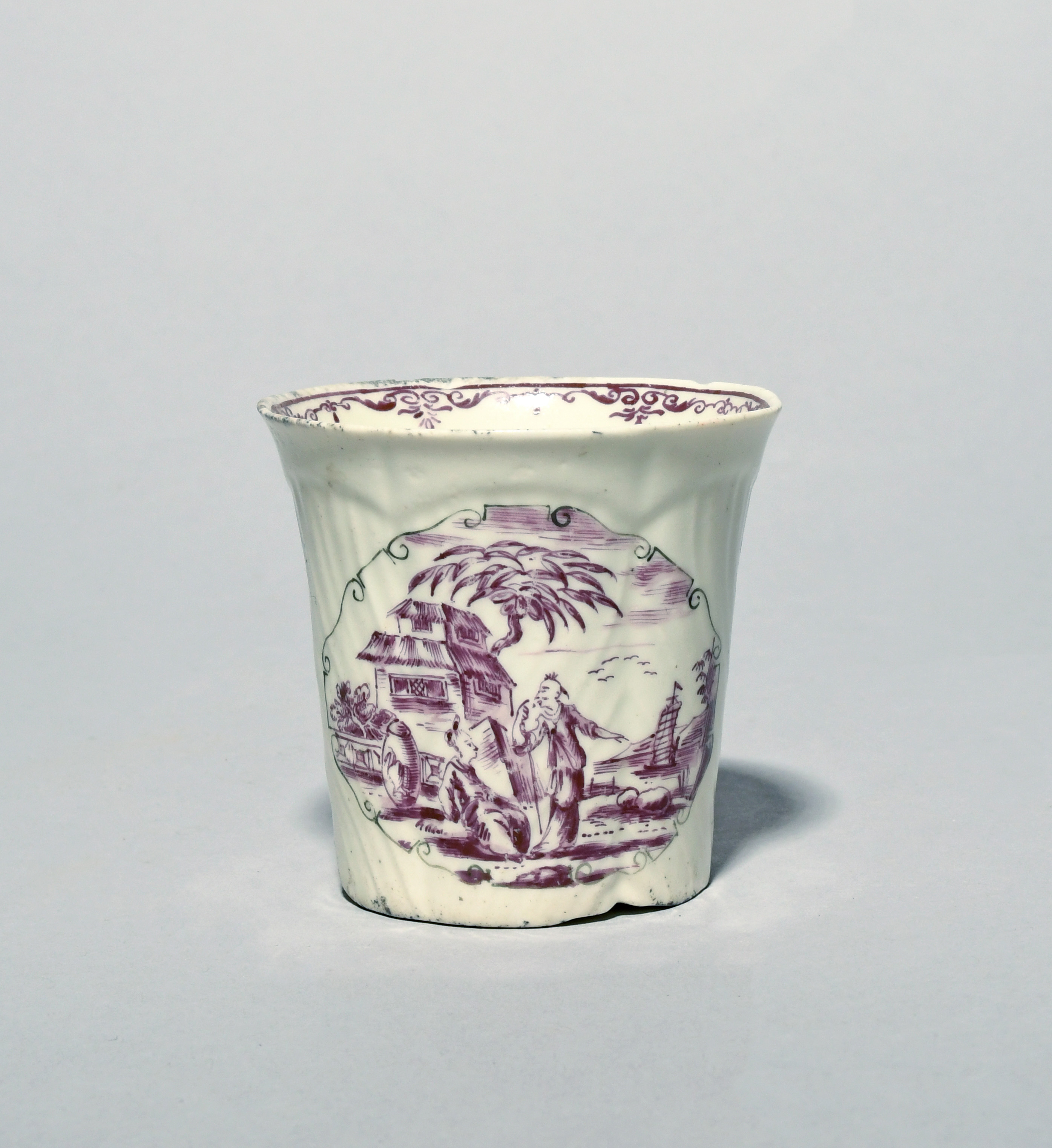 A Worcester feather-moulded coffee cup, c.1758, finely pencilled in puce at a later date with a cartouche containing a Chinese couple before a pagoda and a sailing vessel, flanked by flowering branches, the interior rim with a formal foliate border, blue tin mark to the base in imitation of Plymouth, some peppering, a small rim chip, 6.4cm.