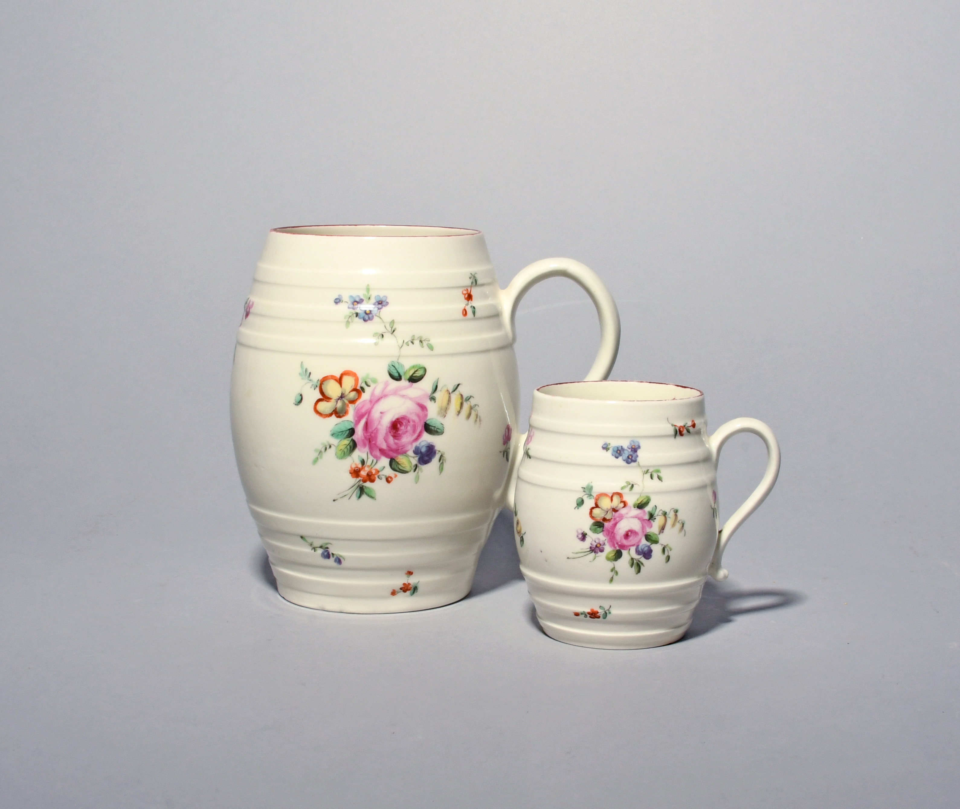 Two Derby mugs c.1760-65, of barrel shape with horizontal ribbing, painted with sprays of flowers including pink rose and blue forget-me-not, with further small scattered sprigs, a small amount of good restoration, 15.3cm max. (2)