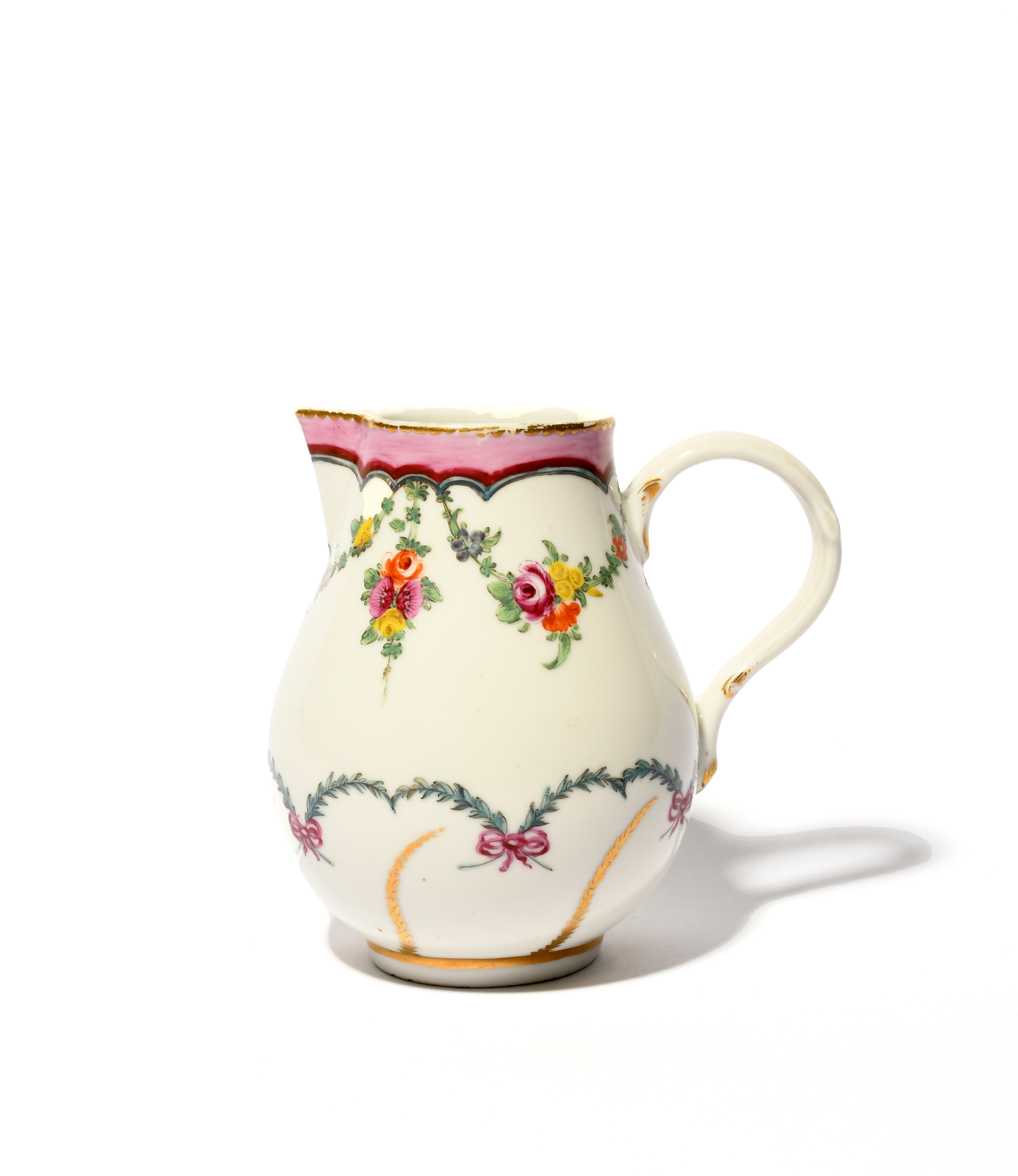 A Bristol milk jug, c.1772-75, well painted with garlanded flowers issuing from a shaped puce rim, above ribboned leaf swags and gilt tendrils, some gilt wear, 11.8cm.
