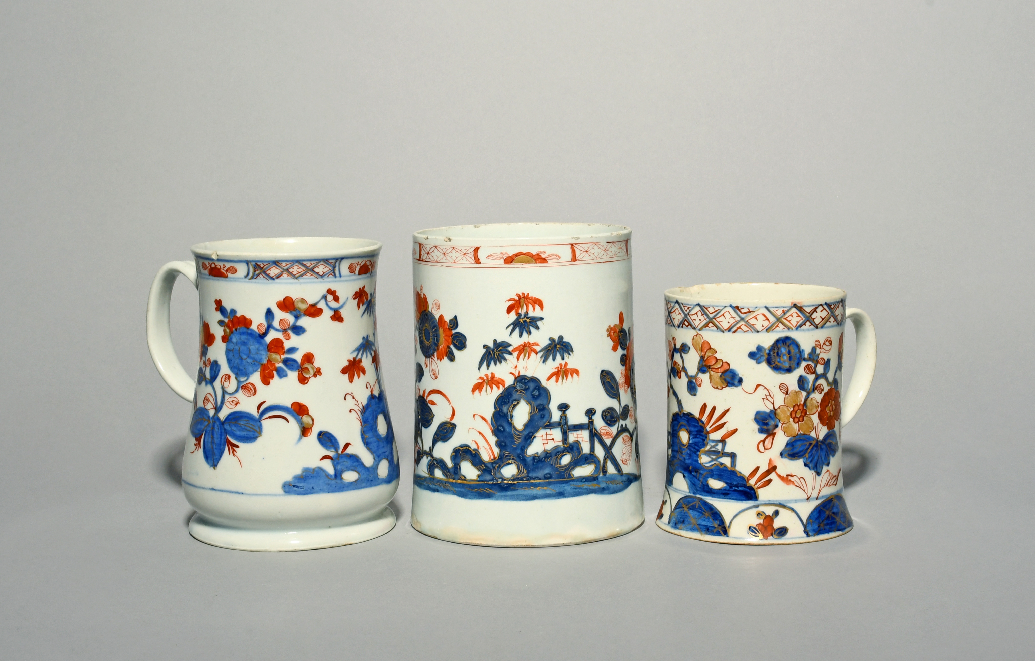 Three large Bow mugs, c.1752-55, of varying shape, all painted in the Imari palette with flowering plants, bamboo and rootwork beside ornamental fences, the rims with panelled or trellis borders, painter's marks to two, two mugs cracked, 15.2cm max. (3)