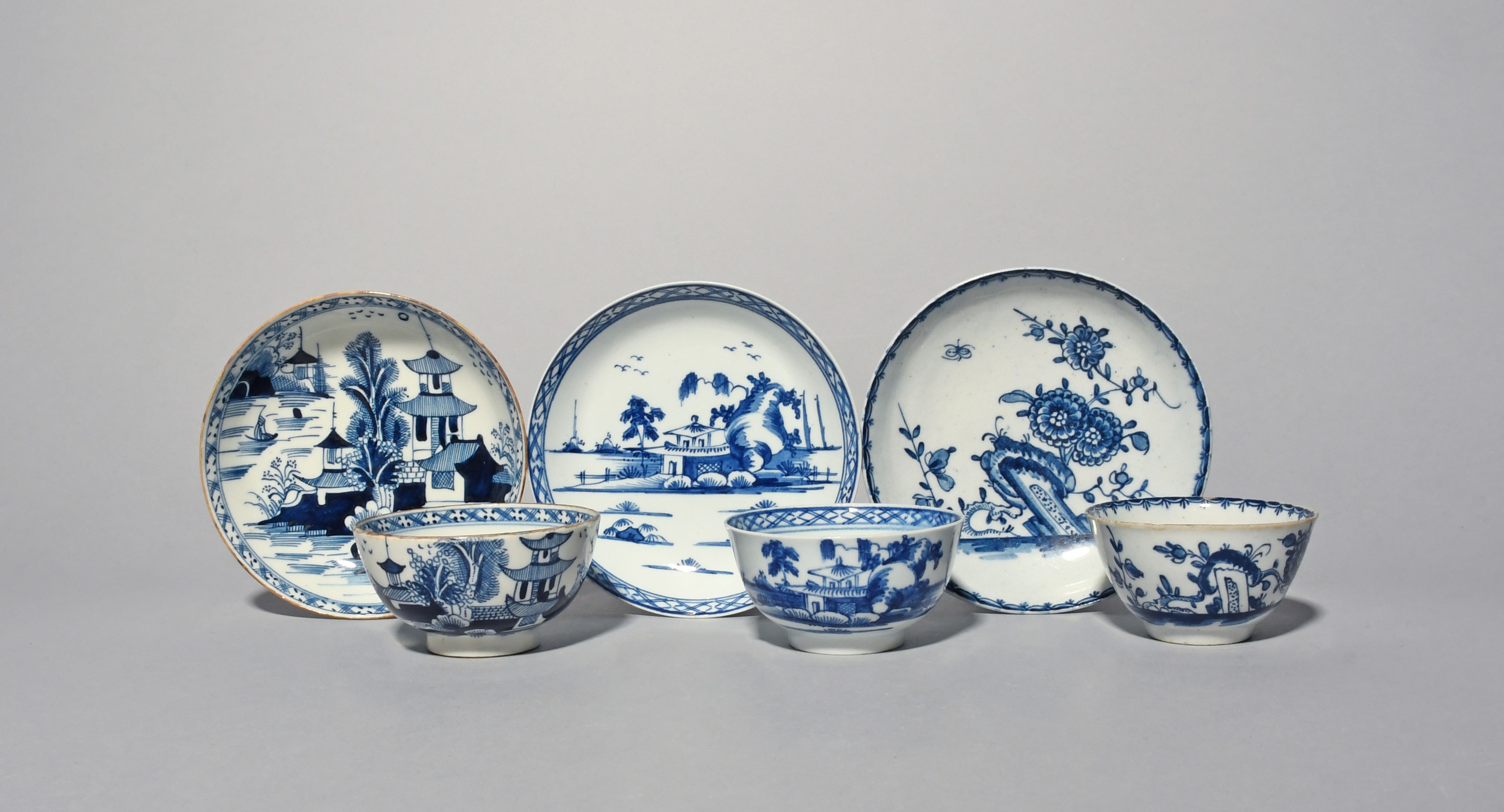 Three Lowestoft blue and white teabowls and saucers, c.1765-75, one painted with flowering branches and rockwork within a berry border, painter's mark to the footrim, the other two with differing pagoda landscapes within a trellis border, 11.8cm max. (6)