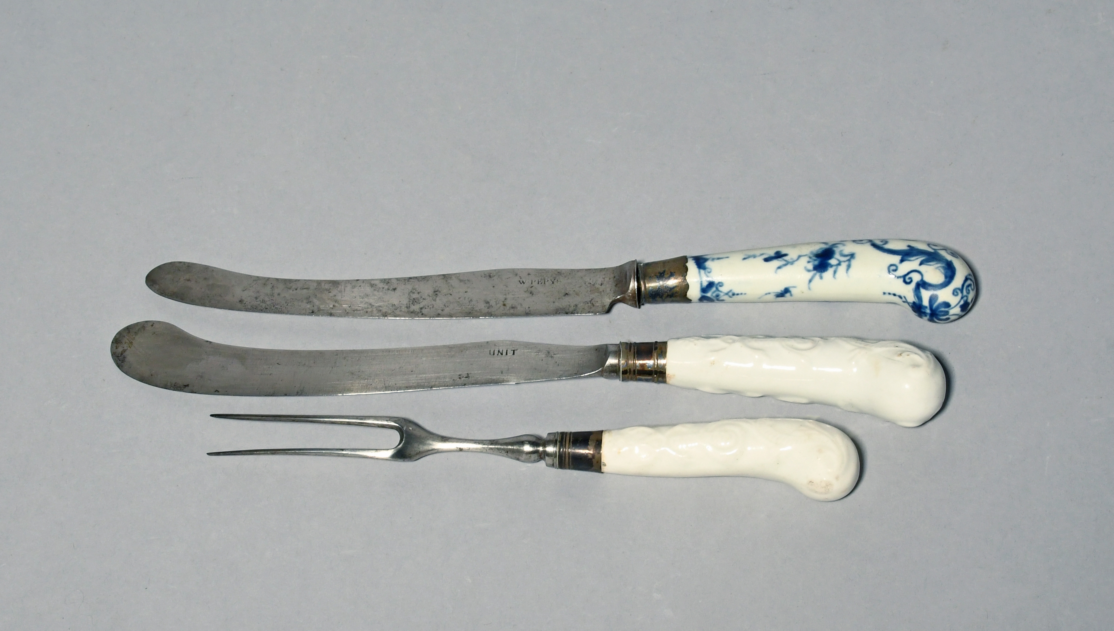 A knife and fork with Bow porcelain handles