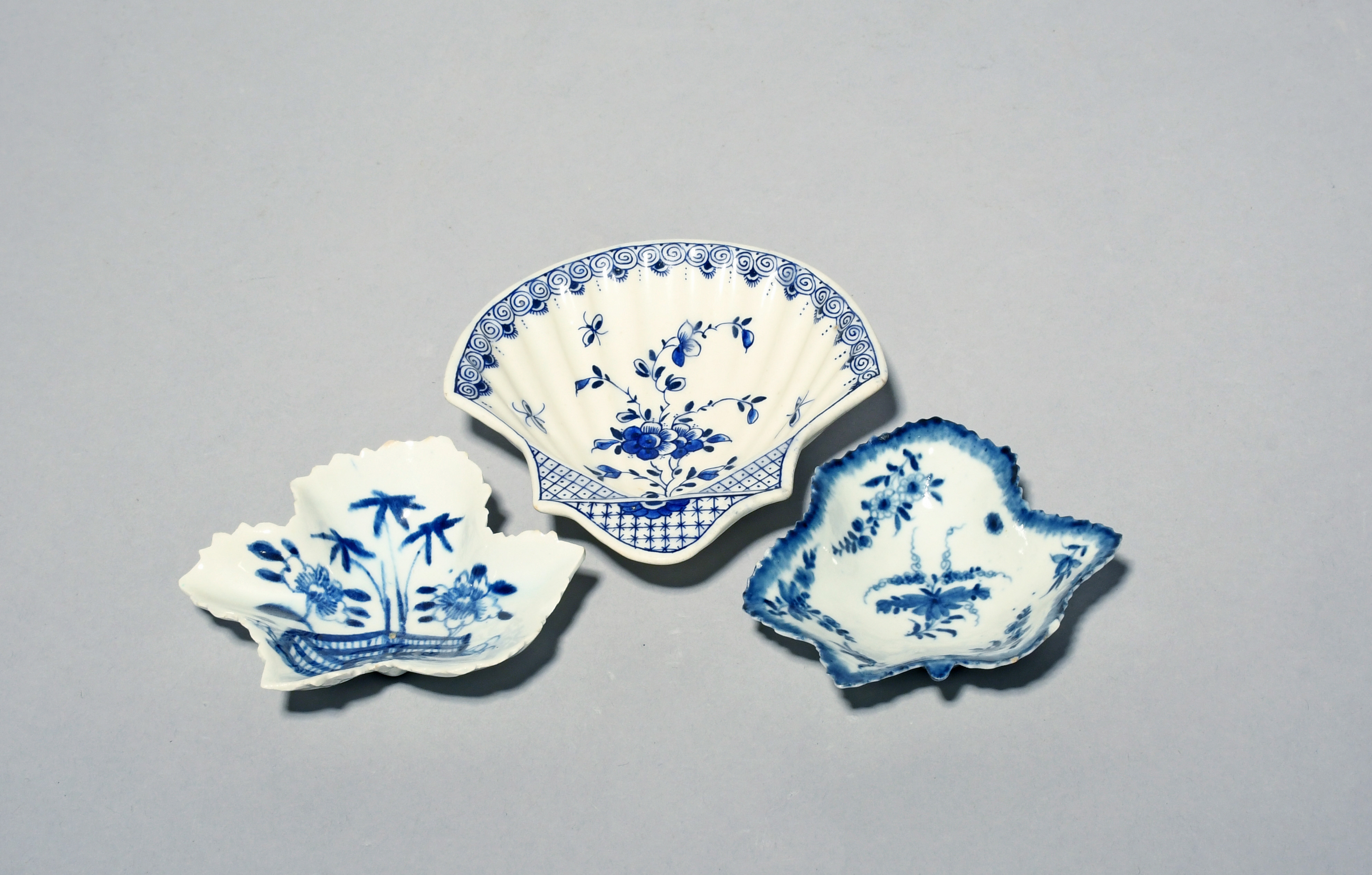 Three English porcelain blue and white pickle dishes, c.1755-65, one Bow and of early leaf shape painted with bamboo and peony beside a zigzag fence, numeral 3 mark, another Worcester and painted with the Pickle Leaf Vine pattern, workman's mark, the last Derby of scallop shell form and painted in a bright blue with insects around a flowering branch, 12cm max. (3)