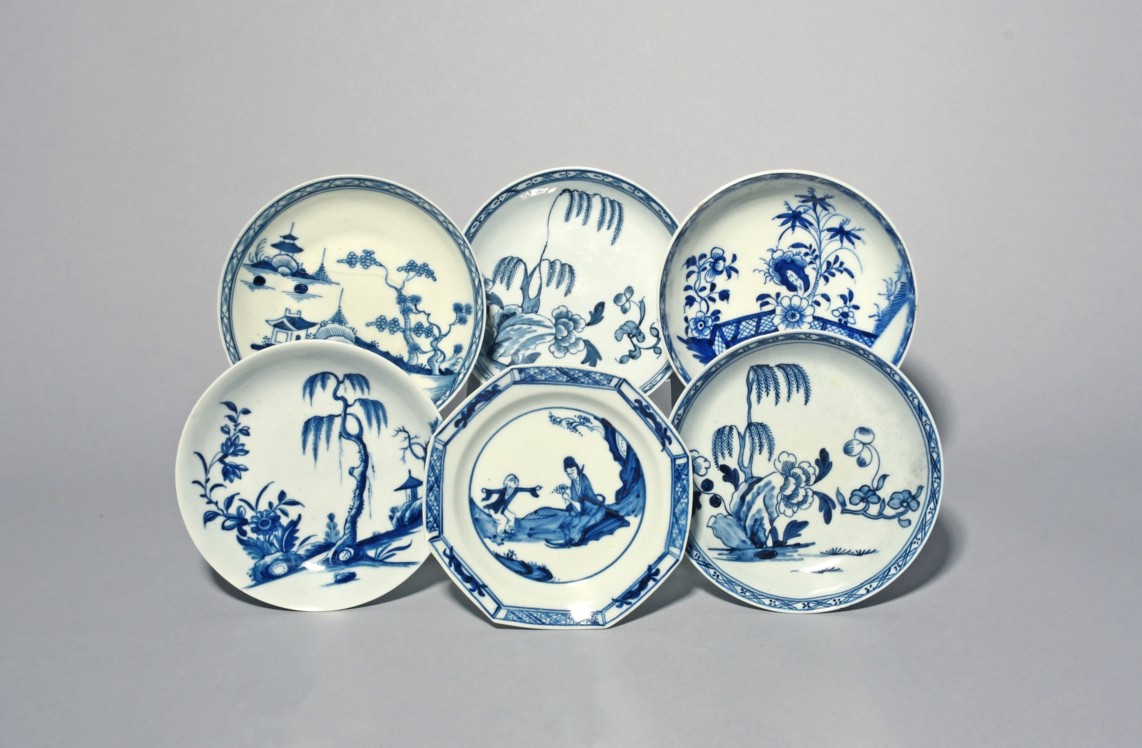Six blue and white English porcelain saucers, c.1760-70, a pair Liverpool and painted with peony and a fringed tree issuing from rockwork, a Worcester saucer painted with the Landslip pattern, another octagonal and painted with the Jumping Boy pattern, a deep Lowestoft saucer painted with plants before a trellis fence, the last painted with a pagoda island landscape, the last saucer cracked, 12.5cm max. (6)
