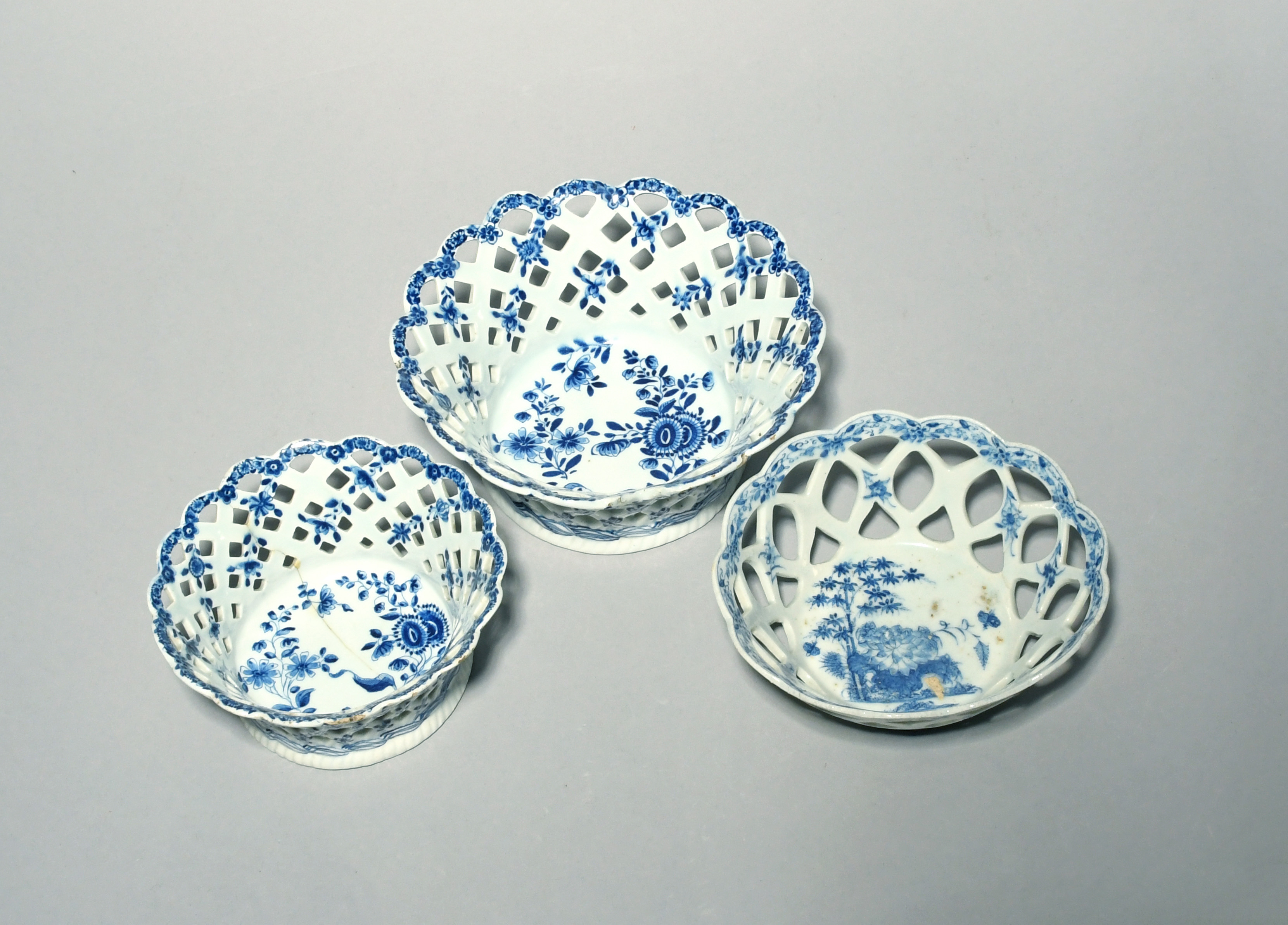 Three Bow blue and white baskets, c.1755-65, of circular form, the earliest painted with bamboo, peony and millet, the other two of varying size and painted to the interior with flowering branches, the exteriors with flowerhead motifs, some damages, 17.3cm max. (3)